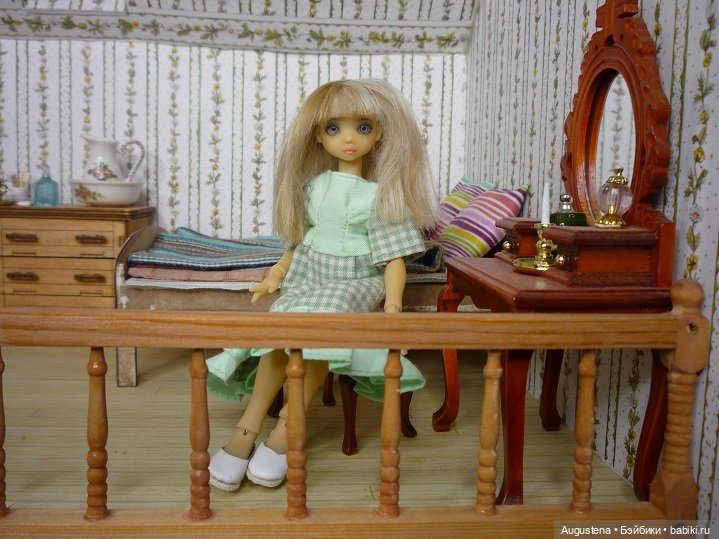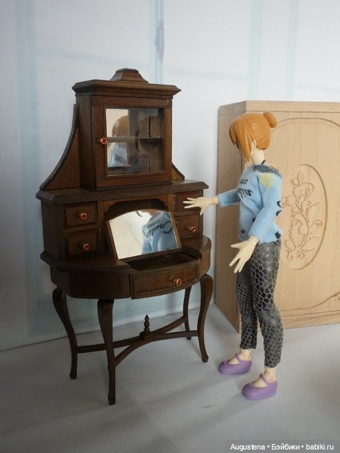 У меня один антикварный туалетный столик, отлично подошёл куклам ростом в 14 см. И есть ещё два современных, их нужно доделать и использовать.
