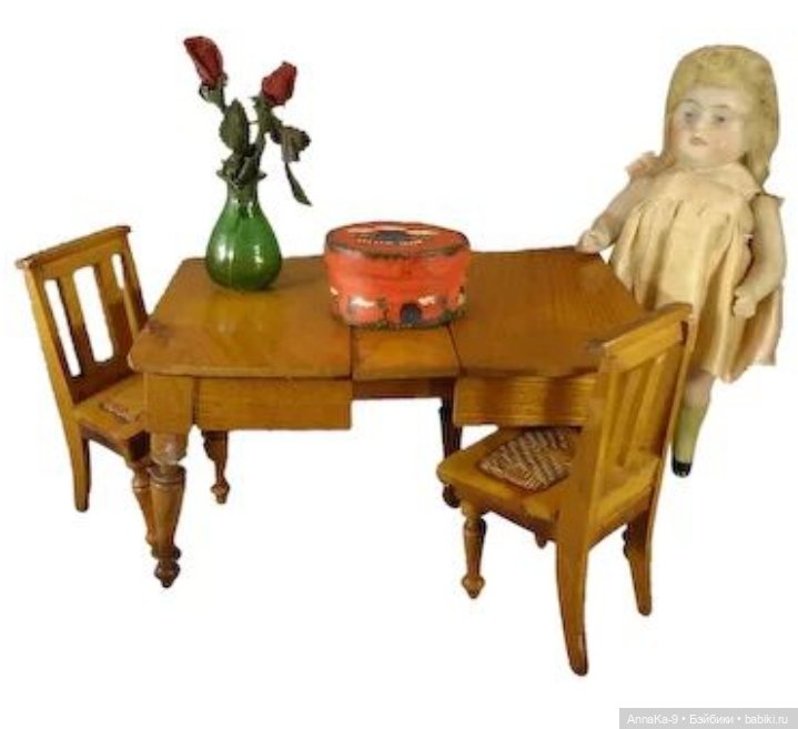 Вот такой столик. Он не старый, такие сейчас вполне можно купить. Хорош тем, что для 1/12 немного великоват. Куколка 13-14 см. смотрится за ним немного по-детски, а Котя ( 16 см.) вполне органично.) Я вообще долго и кропотливо подбирала мебель для Коти. Нужна была именно крупноформатная.)))