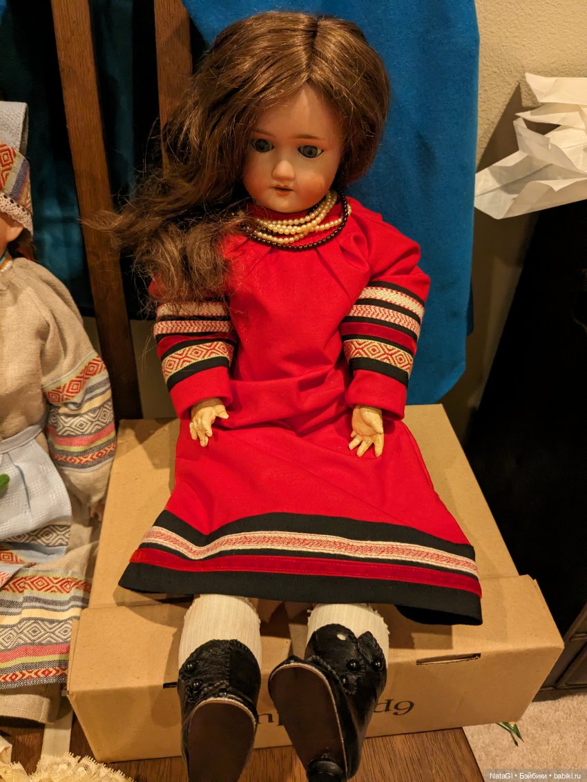 После работы над заказным кокошником для кукольного костюма в русском стиле, захотелось мне и для своих кукол сшить русский костюм. За примером далеко ходить не пришлось, у меня остались фото куклы в русском костюме, приезжавшей когда то на перетяжку. Дальше долго собирала материалы и выбирала жертву для примерок. Как всегда безропотно согласилась Симочка 1079, добрейшая кукла.Костюм, как и оригинальный, состоит из рубашки на бретелях, блузы, юбки, фартука-завесы и головного убора. Лапти вязать не стала, кукла 56 см, ей лучше сапожки ( у нас белые, а в идеале лучше черные или темно-красные). Материалы использованы разные и современные бязь, шелковые ленты, пестрядь и винтажный хлопок, и антикварное кружево. Вышивку крестиком честно делала все праздники по старой выдергивающейся канве:))
