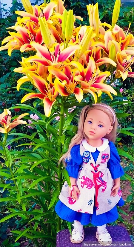 -«Мы не пьём чай, деточка», церемонно качая головками ответили лилии,-«по утрам мы пьём только свежайшую росу и принимаеи у себя изящных пчёл, утончённых ос и важных, мохнатых шмелей, иногда, правда, залетают бабочки и мотыльки, но это так, однодневки- мы не поддерживаем с ними знакомства, если хочешь, приходи и ты, а теперь прощай, нам пора ложиться спать». Жози побежала к дому:«меня, наверное, уже давно ищут „подумала она, но вдруг остановилась, как вкопанная: любимая кукла осталась сидеть там, где её оставили — неподалёку от прудика с вредными рыбками, пришлось возвращаться, кукла сидела на том же самом месте, где её забыла Жози и обиженно хлопала ресницами,