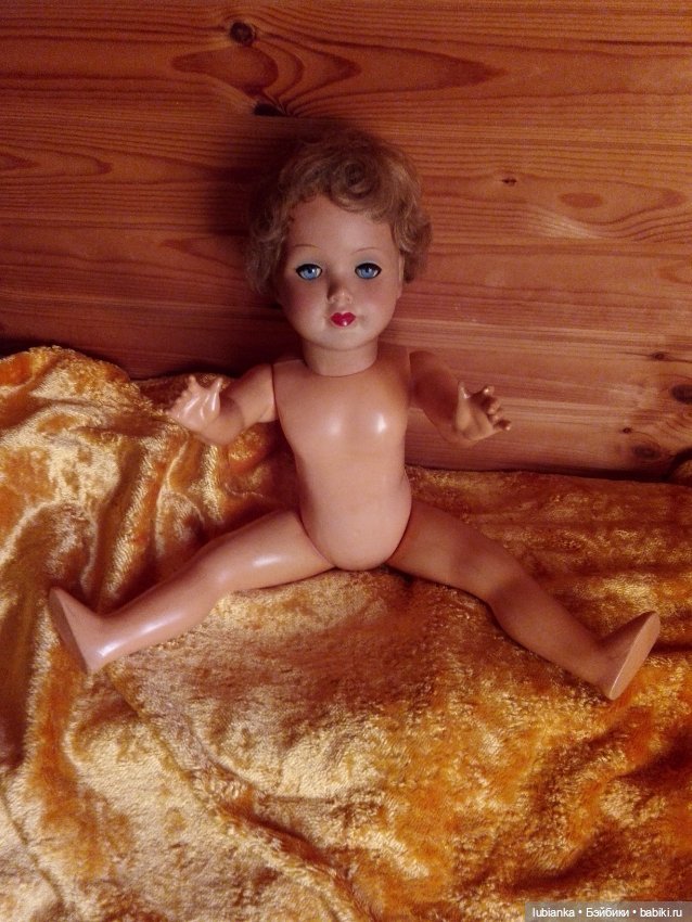 Пришла ко мне очень интересная девочка из колкого пластика. Рост 56 см, неплохое состояние, но нет клейма! Парик, закрывающиеся глазки, хорошо проработанные ручки, пищик, кожаные туфельки на кнопочках. Надеюсь, что знатоки винтажных кукол подскажут кто это.