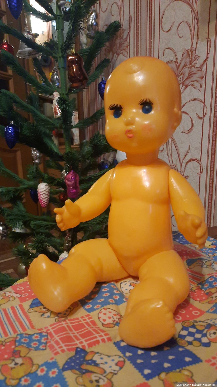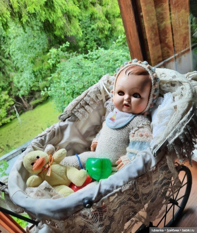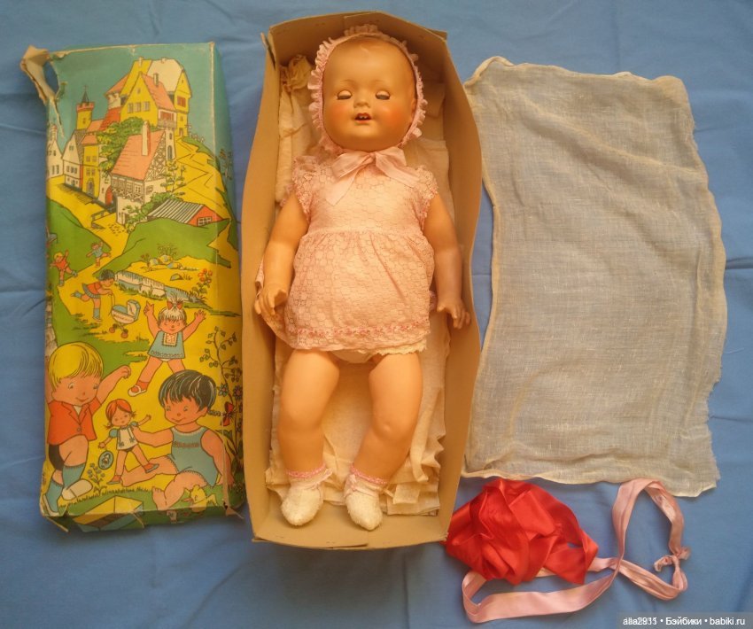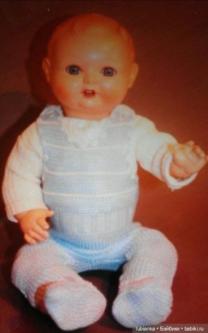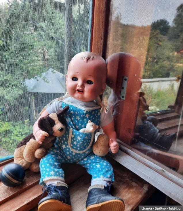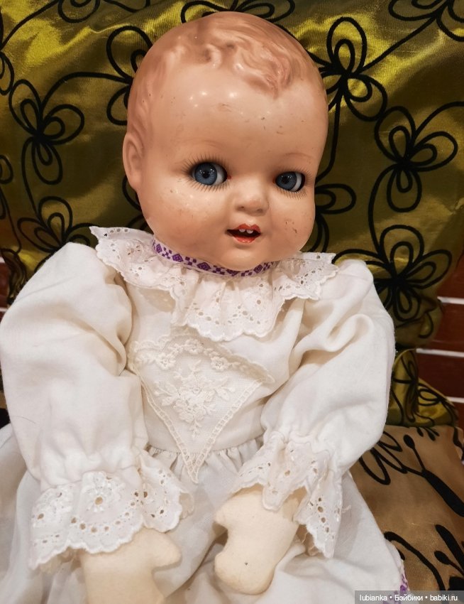 Для меня он существовал всегда, и до сих пор есть. А вот одежда его не сохранилась, более того, я совершенно ее не помню! Я с ним почти не играла, он всегда считался маминой куклой, да и довольно громоздкий он был. Так что, куда одежа девалась, загадка. Правда, я, все же, успела выдрать ему ресницы и повредить язычок. И чуть отбито над глазом. Надо бы его отреставрировать, конечно, но я пока не умею.