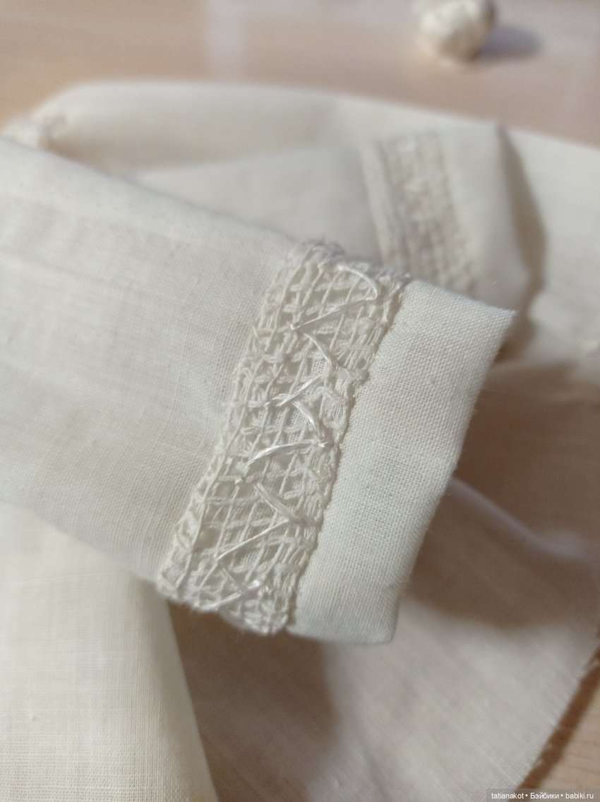 А как интересно порой разбираться в этих останках! Могу сравнить себя с археологом, восстанавливающим жизнь прошедших веков. На этих тряпочках можно и поучиться! Так, на одной из моих кукол было ветхое летнее платьице с отделкой из полосочек хлопкового тюля. Именно тюль и никаких кружев. По нему простенькая вышивка «козликом» вискозными нитками.
