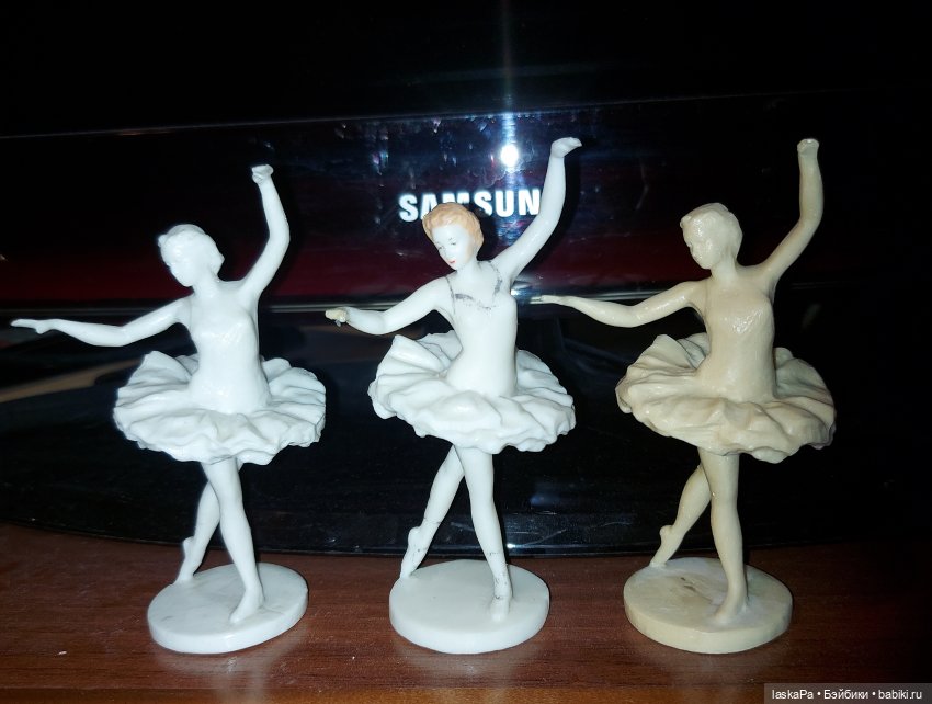 А пластиковые (не знаю, как точно определить материал, что-то типа бакелита) фигурки — это вообще «классика» СССР. У всех, мне кажется, были балерины, реже встречались конькобежки. У меня есть, кроме такой же качалки, собака и тройка лошадей, но их не расскрашивали. В данный момент не могу просто сфотографировать.