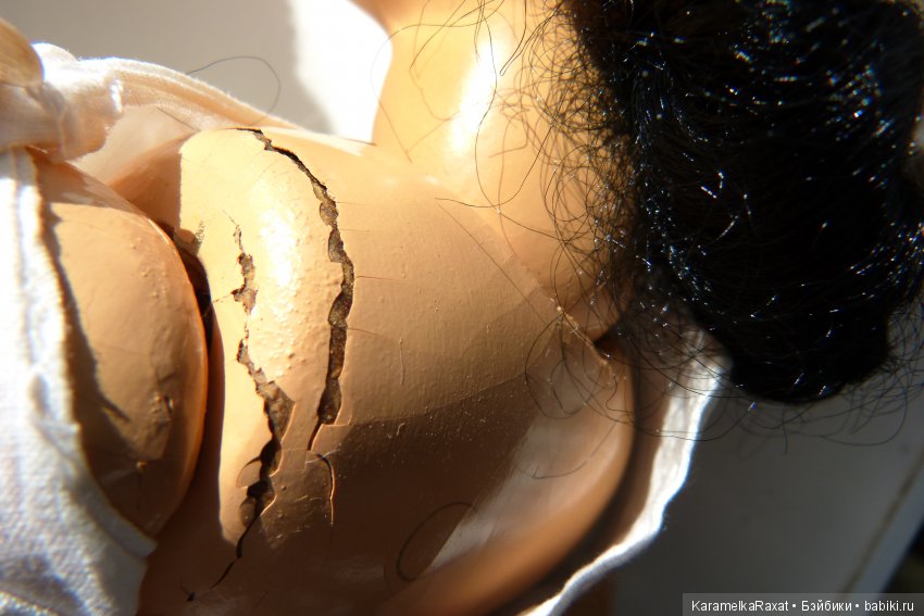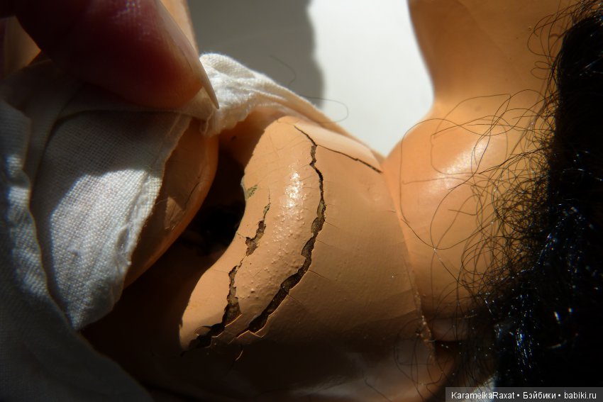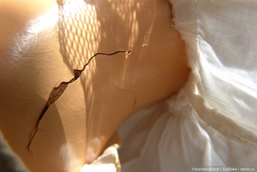 Резинки растянуты, ручки и ножки обвисли как плети.Кракелюр тонкий, как паутинка по ручкам, ножкам, личику.Сыпется краска.Местами просто осыпалась совсем.В животике большая дыра-там когда-то был пищик.Девочка покрыта пылью и грязью.Трещина на голове.Паричок… с лысинкой.