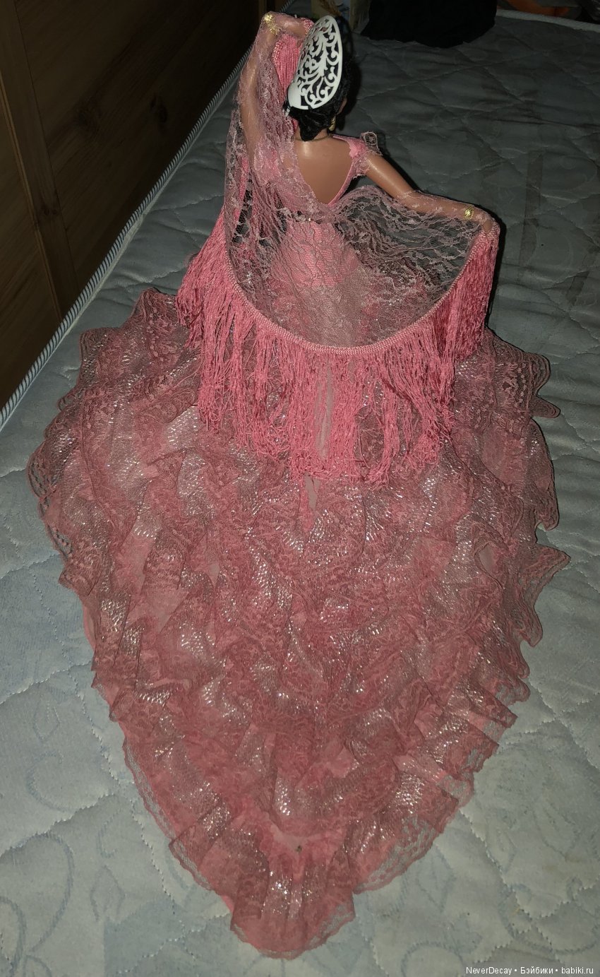 Я пролистала чуть ли не весь интернет и узнала, что они бывают ещё и 44 см ростом, тогда для меня это было открытием, но когда я купила эту красавицу, то просто не ожидала такого сюрприза. Продавец мне сказала, что она примерно 40-50 см, а на деле оказалась гигантом! Диаметр платья достигает примерно 85 см. И у неё очень интересно задуманы ноги, её можно поставить с помощью подставки и будет казаться как-будто она застыла в танце. Правая нога у неё вертится до конца, а вот левая нет (у неё стоит какая-то блокировка), чтобы у неё постоянно было поднято колено, а так она сидит спокойно где угодно. Кукле примерно 30 лет, а может и больше, волосы мохер, ещё были туфельки, но купила уже без них. А вот и фото, смотрите и любуйтесь))):