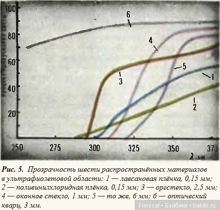 Разные материалы имеют различную прозрачность для ультрафиолетовых лучей в зависимости от длины волны. Для экстремального диапазона непрозрачен даже воздух! Оконное стекло пропускает диапазон А, но не пропускает 3 других.