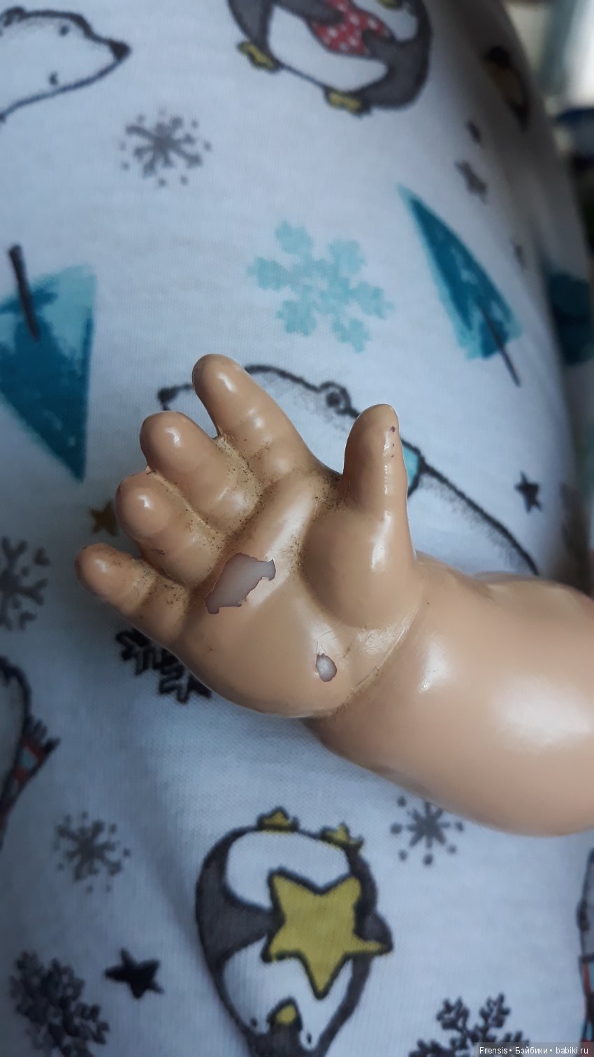 Тело в местах креплений было тоже протертым, но владелица просила починить только пятку и глаза.