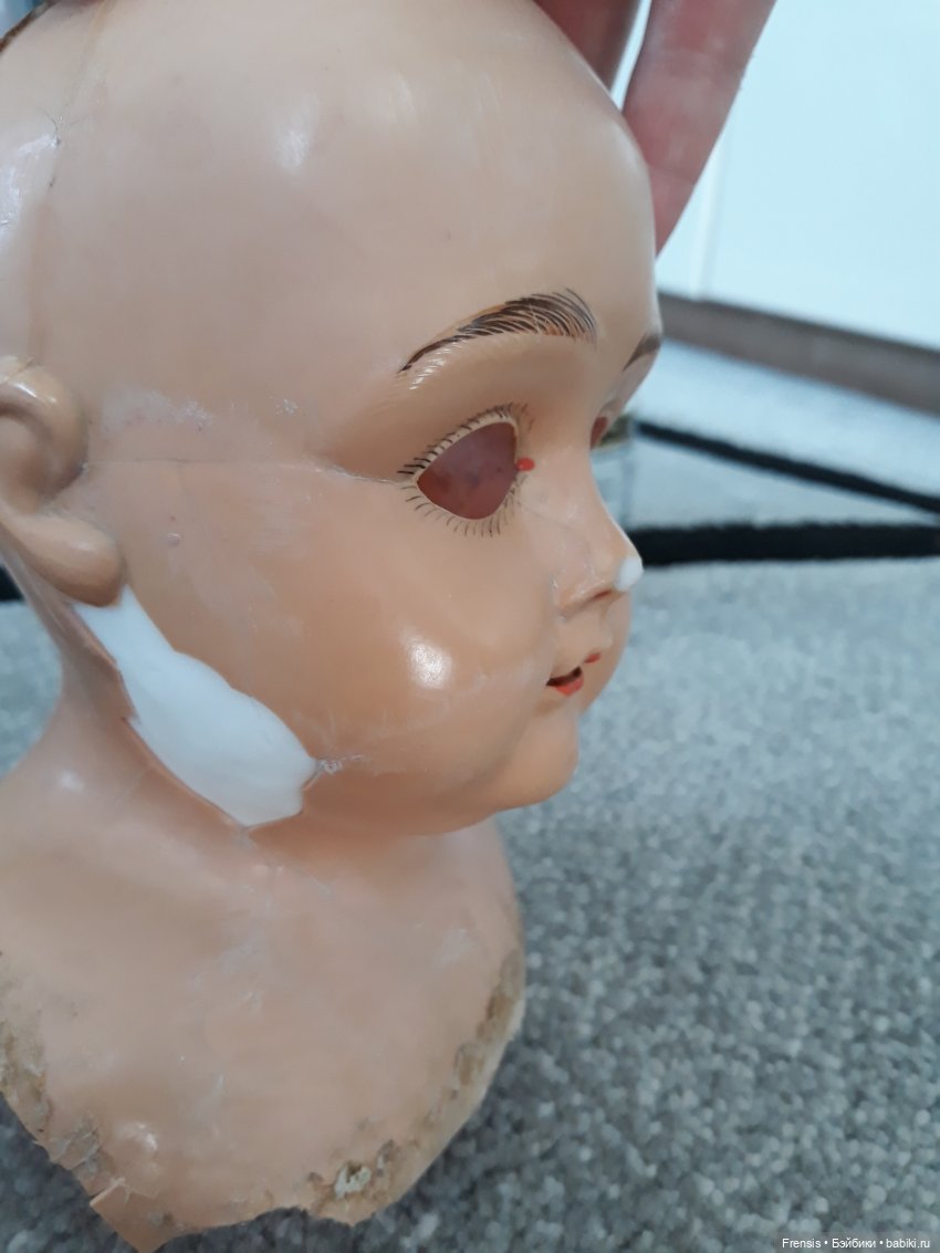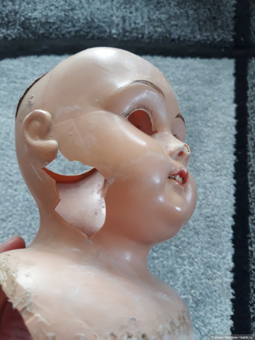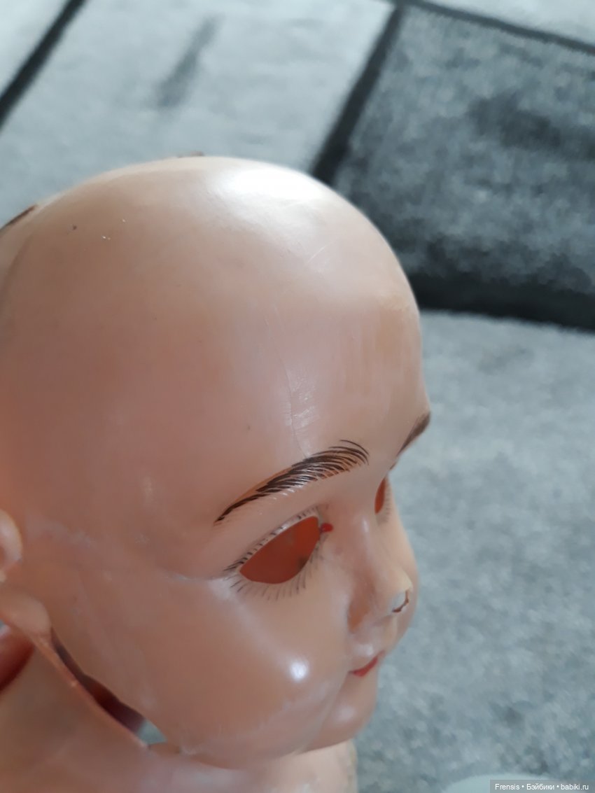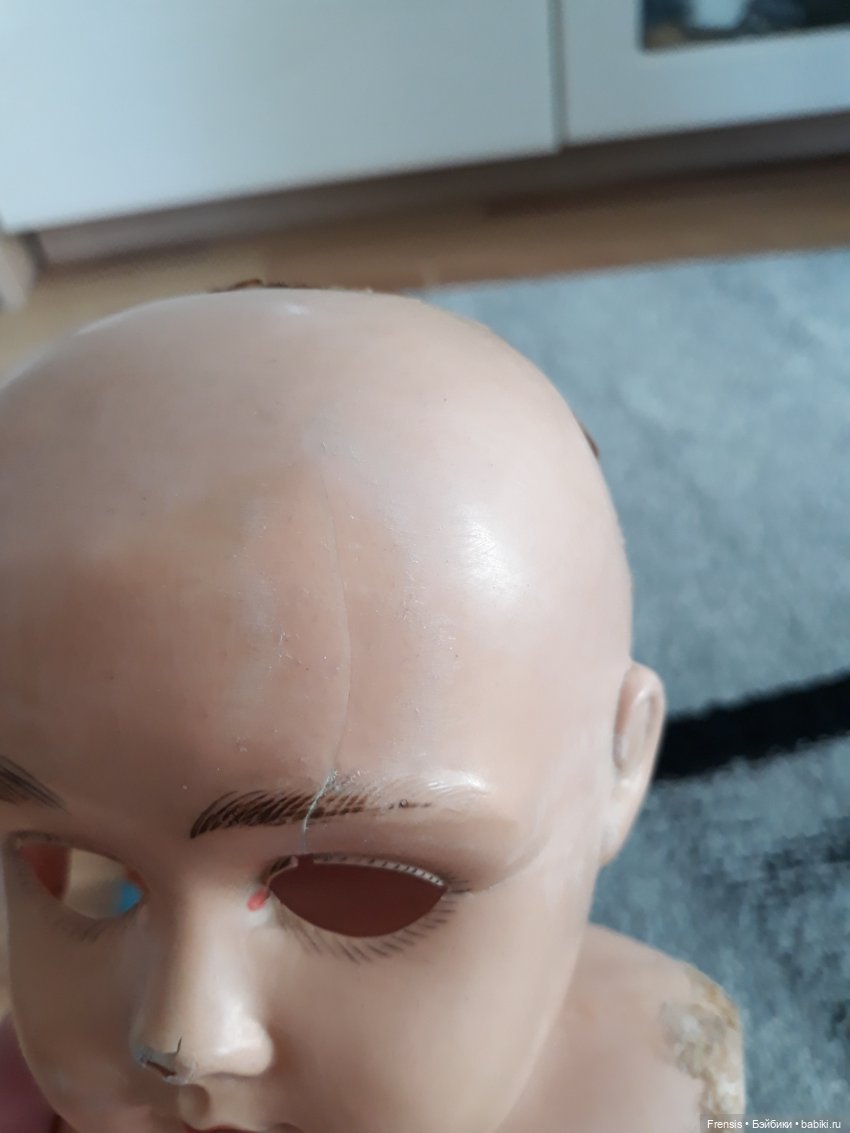 В общем, малышка с большими потерями, трещины, дыра в щеке. Глазной механизм очень длинный и глаза спящие. В книге у подобной куклы — фиксированные.
