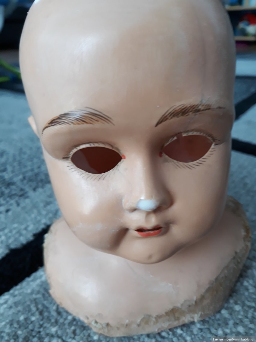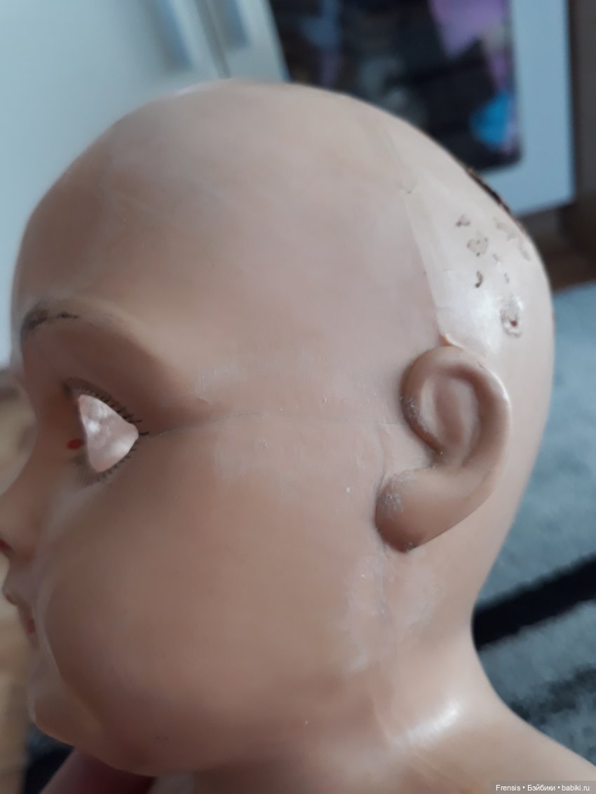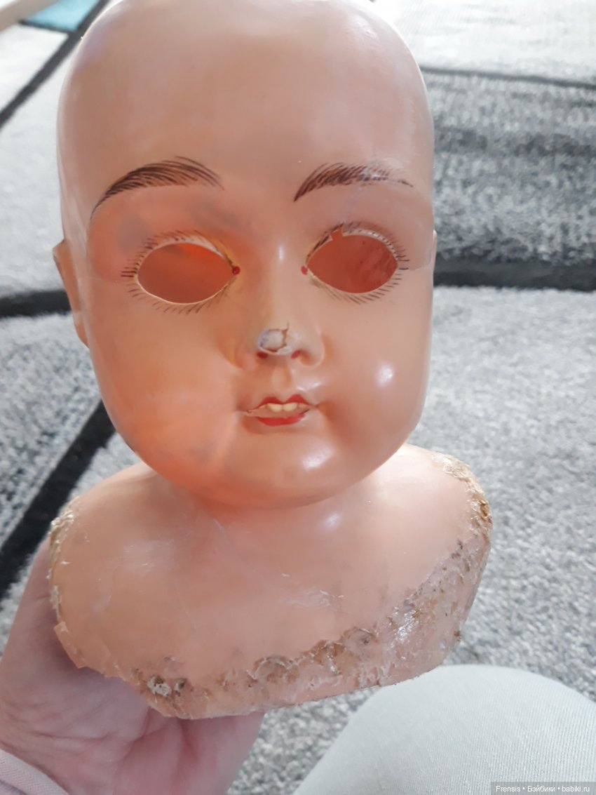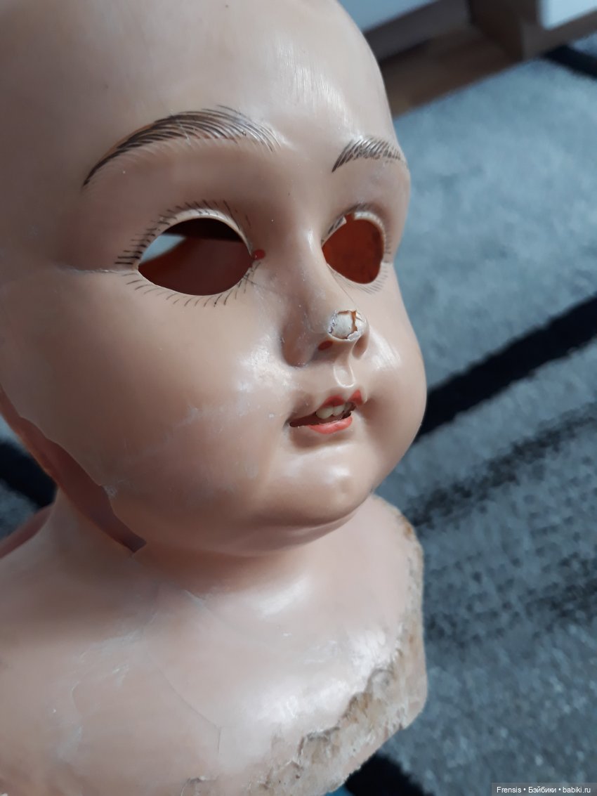 В общем, малышка с большими потерями, трещины, дыра в щеке. Глазной механизм очень длинный и глаза спящие. В книге у подобной куклы — фиксированные.