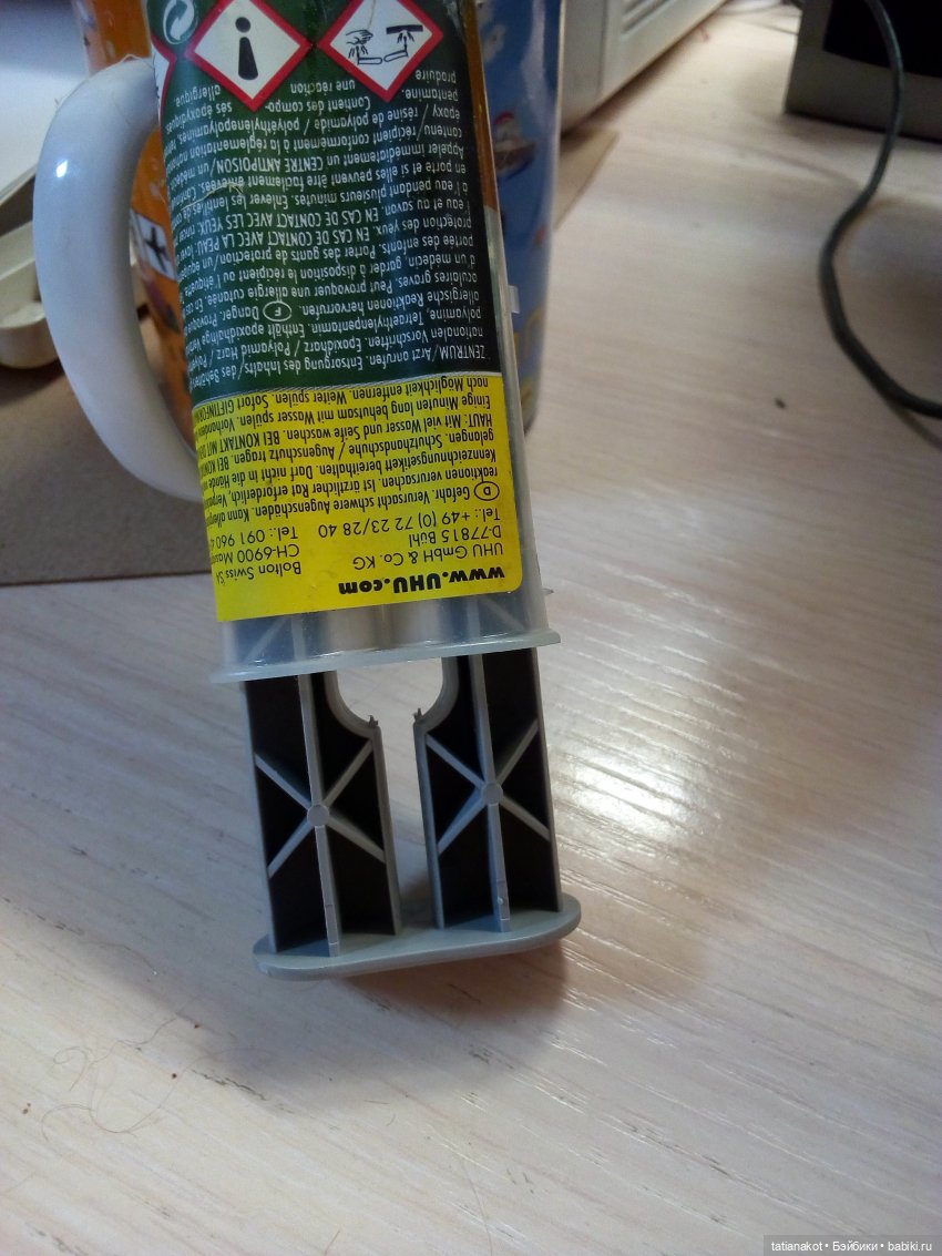 за 90 рублей 45 граммСразу распишу их различия и некоторые трудности. Первое-время «жизнеспособности » рабочей смеси.Это то время, пока вы можете манипулировать склеиваемыми или вылепленными фрагментами.У первого клея-это 5 минут, у второго 20-30 минут. Первый клей довольно вонюч и работать надо с осторожностью(вытяжка желательна), зато им можно клеить «трудные» сколы и детали, которые сложно чем то закрепить для длительной экспозиции… второй клей почти не пахнет, но довольно текуч-им хорошо пропитывать ткань для укрепления «волосин » и прочих трещин внутри (например) головы куклы.Ткань становится стеклоподобной и голову потом можно мыть.Очень надежная и аккуратная страховка получается! Еще такой вопрос я так и не решила для себя-на упаковке клея Unibob написано-«удалите предохранитель с поршня шприца и защитный колпачок на концах дозаторов» Второе я поняла-нужно обломить(перекусить) кончики дозаторов(шприцев) и этот «обломок» как раз будет для них крышечкой.А вот где это самый «предохранитель»?.. Вертит мартышка так и сяк… ничего не понимаю. Решаюсь выдавить «на авось»… выдавила. столько, сколько мне не надо, ибо поршень в шприце сначала «заел», а потом выдавил почти все.Конечно, некоторое колличество я использовала, но основная масса пошла в мусор. Потерпев такую неудачку, я решила подстраховаться и сделать по-своему.Я разъединила (перекусила кусачками) соединение поршней и стала выдавливать компоненты по одному и в разных местах.Почему? да потому, что пока они не смешаны, процесс не идет и можно зубочисткой или лопаточкой переносить для смешивания совсем маленькие порции.