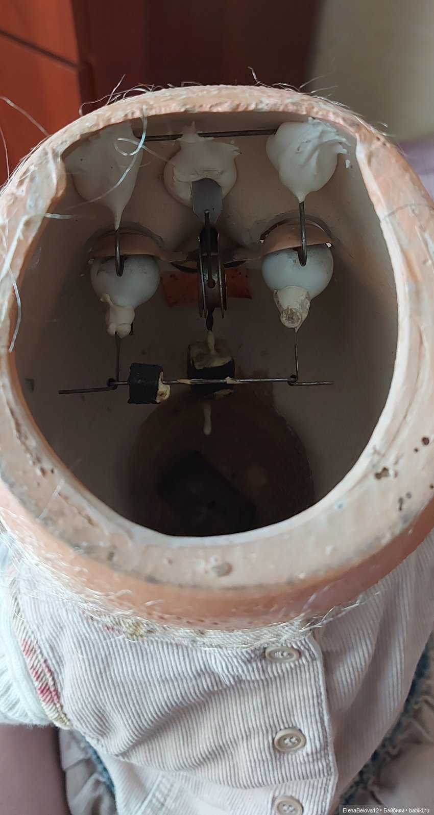 При чистке все- таки начала облупляться краска на туловище, придется грунтовать. Надеялась, что обойдется, но …Голова, руки, ноги целые без трещин, — уже радует. И резинки натяжные в очень приличном состоянии. Вот только глазки 🥲Буду искать МК и соображать