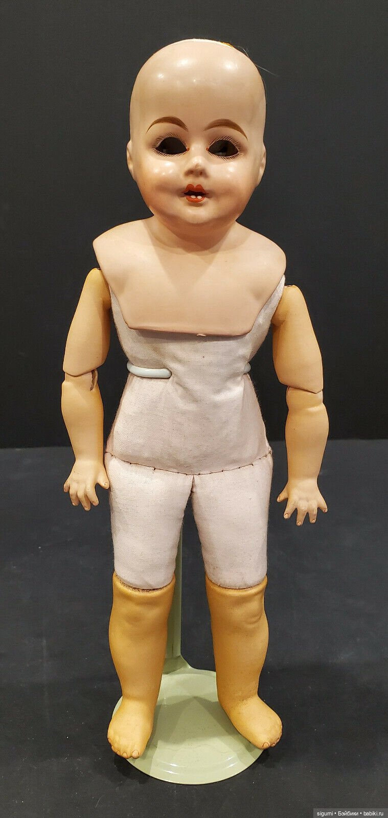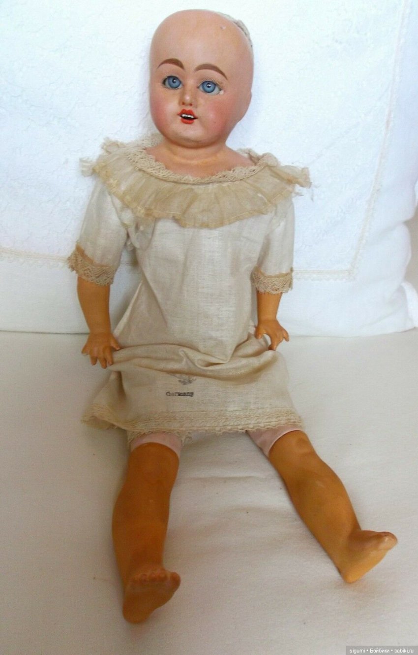 Голова куклы с выразительным бюстом, ручки с изящными и совершено целыми пальчиками, ножки — из композита, туловище — из ткани. Парик куклы из натуральных волос. Ротик приоткрыт. Возможно к кукле прилагалась соска.