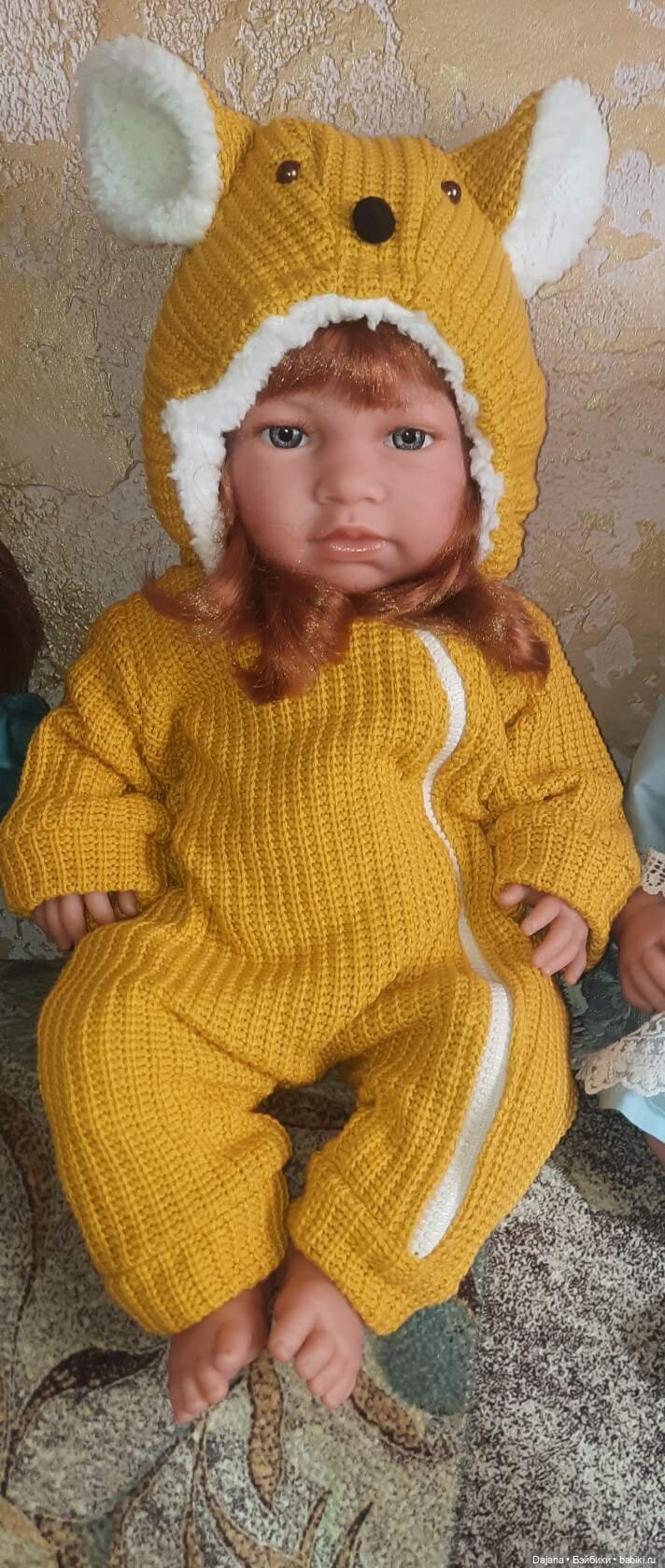 Почему выбор пал на неё: 1) думаю ей подойдут вещи от младенца 50 размера, у меня много красивых; 2) понравилось ее лицо, я у кого-то тут увидела рыженькую, даже не помню где и как узнала имя; 3) ура, обе ручки раскрыты, ну не люблю я эти кулачки; 4) чёлка в середине короткая, по бокам длинная и прикрывает ушки, как бы обрамляет личико, делая его ещё милее и прикрывает прошивку волос (ее немного только около ушек видно, сбоку); 5) можно заплетать косички, колоски, расчесывать — игры для дочки, а так же обнимать, поскольку она мягкая.