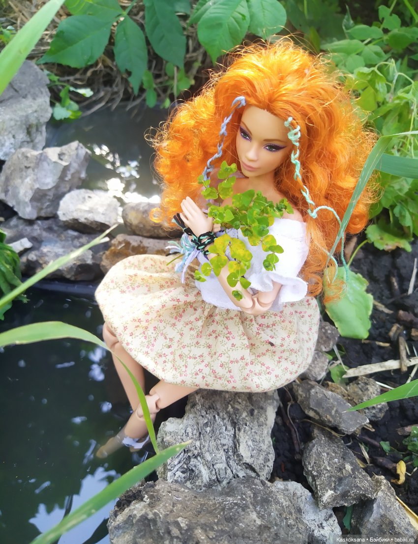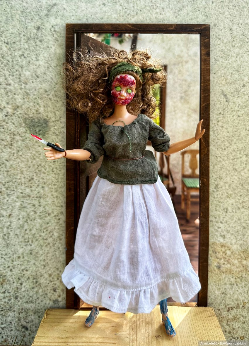 Начала с волос. Намазала кондиционером. Можно было бы и белком, но лень было отделять от желтка, а потом пристраивать желток. Малина на даче есть, одной ягоды хватило, на лицо куклы под малиновую массу нанесла жирный ночной крем. Так и маска лучше держалась, и снимать легче, и пигмент не впитается. На глаза все на тот же крем прилепила кусочки полимерного огурца (у меня был в нарезке, очень удачно), а крем из голубики имитирует акриловая краска.