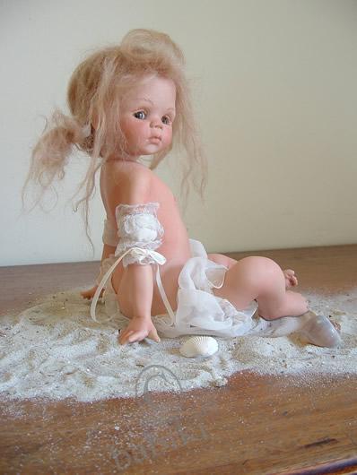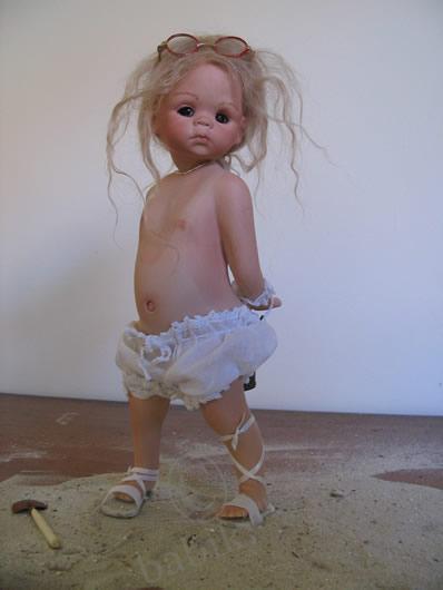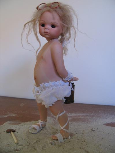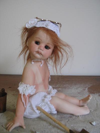 Почти три года назад я ездила с сыном на выставку кукол и игрушек, проходившую в ЦДХ. Там также были выставлены авторские куклы, одна из которых поразила меня в самое сердце! Это была маленькая фарфоровая девочка в купальничке с лопаткой и следом от загара.