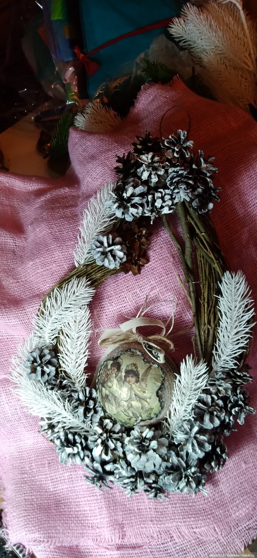 Вот дочке и сделала. Ещё летом скручу венок и остатками шаров, цветов и веточек белых украшу… Я ей предлагала в раму для картин вписать декор, она отказалась… Думаю, интересно было бы… можно на белой мешковине, вуали, тюльке, но можно на ветках повесить, вписав раму…