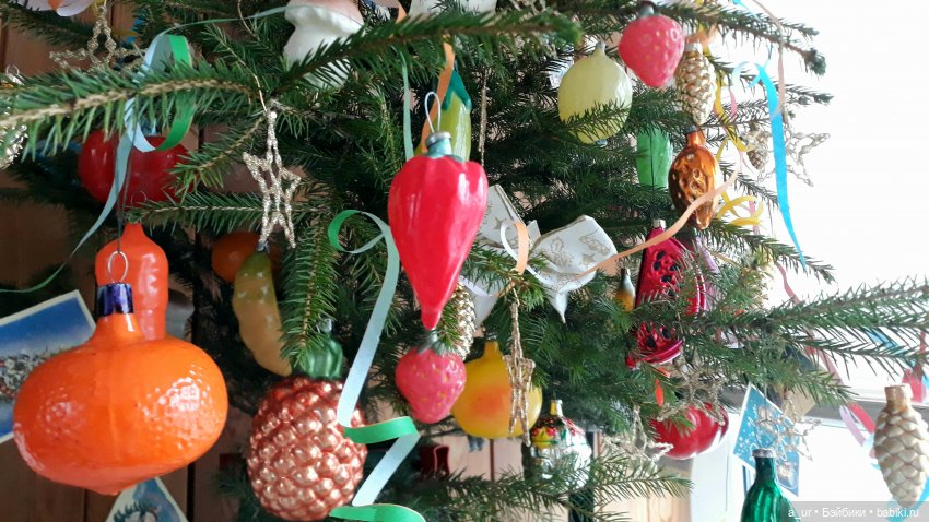 К сожалению, эти игрушки только мои воспоминания, а потому лежат в коробочках. Иногда вешала часики из 60-х. И бусы из стекла.