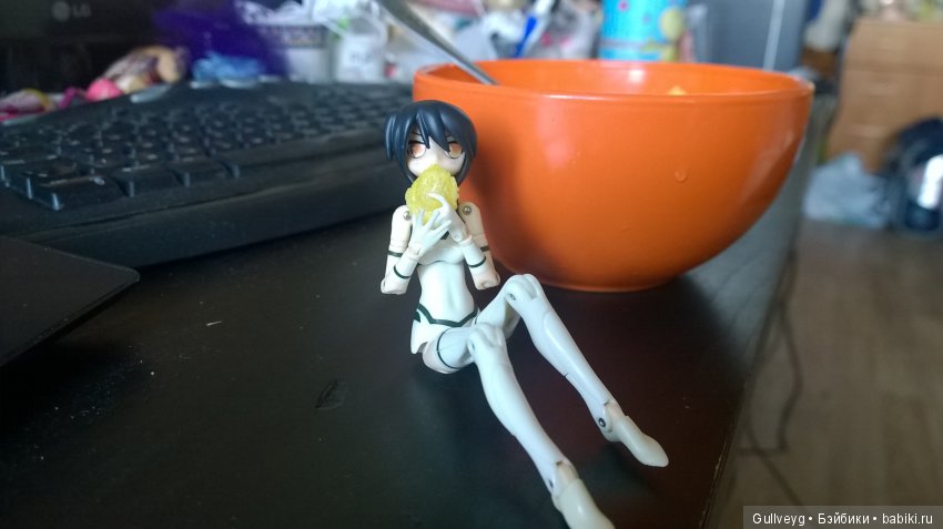 Легендарное тело 24см меня не сильно впечатлило: пышноватое и округлое — это да! — но штыри не плотные и руки надо подтыкать. Кроме того, само тело обрезинено, смотрится красиво, но внутри — пластиковый остов с болтами, а резина может моментально окраситься даже от грязных рук >.< Однако, эта тушка может согнуться «в три погибели».