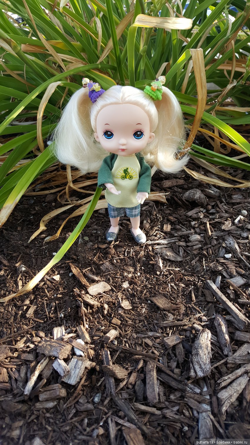 Сама стоит, шарниры очень даже приличные, волосики не распускала, хвостики милые, пусть пока так ходит. Вообщем, для игры самое то.