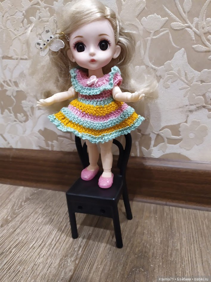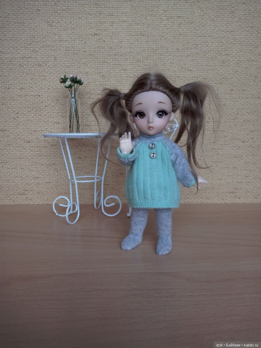 Блондиночка сидит странно, потому что поломанную ножку я не очень хорошо смогла починить, разъезжаются в стороны ножки. Но продавец уже выслал новое тело.