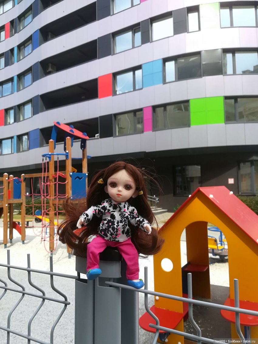 Прошли совсем немного и за большими деревьями на цветочной полянке увидели детскую площадку! Как интересно тут! Какое строение разноцветное! Ого! Вероничка уже на верхней площадке детского городка!