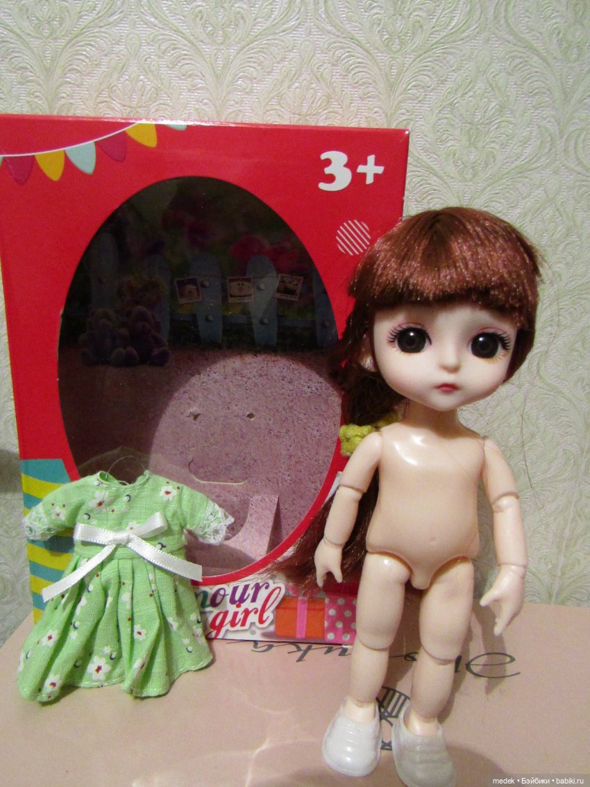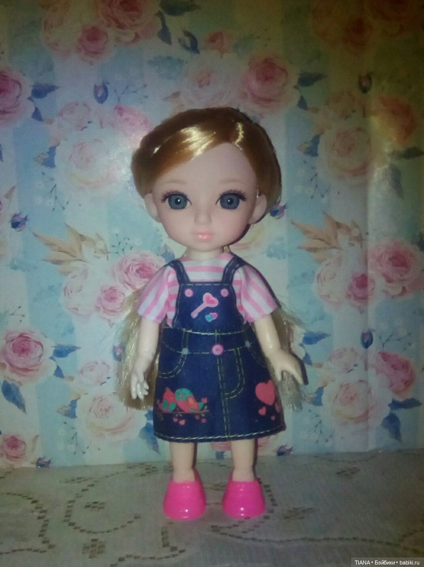 Платьице сшито не очень, но ткань ситец, не фантик. И одна ножка не сгибается в колене, надо немного подрезать сзади.
