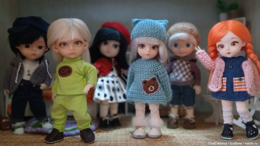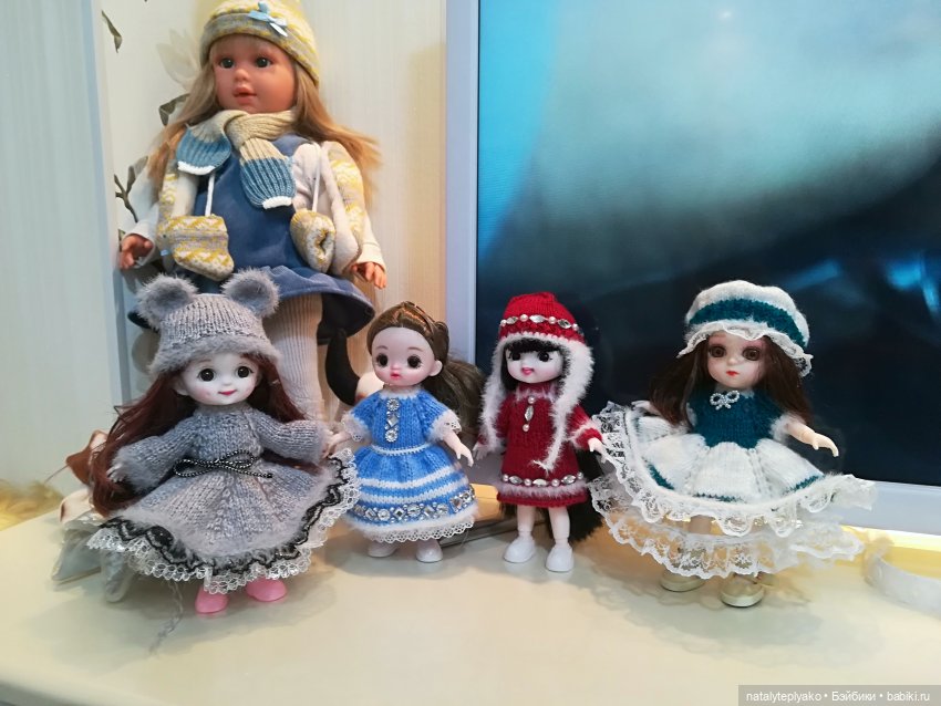 Долго я наблюдала за тем, как многие кукольники приобретают шарнирных малышек -баболек.Сама вроде и не собиралась их брать.Есть у меня куклы такого размера ,-мини американ, крузелинки и другие.Но зашла перед новым годом в магазин, есть у нас такой «Паритет».Там много чего интересного, в том числе и игрушки… А как же пройти мимо кукол, хотя бы посмотреть… А тут подруга моя, кукольница, увлеклась баболями и выписывает их из далека.Решила я что можно ей купить их и у нас.И вот уже в конце февраля поехала я в тот магазин, посмотреть… Ну и посмотрела… В итоге приехала домой с целым пакетом всяких нужностей, для кукол.Прикупила и себе пару девченок, почему то в наших магазинах нет мальчиков.Домой принесла, открыла и сначала мне они и не глянулись, прошивка волос не понравилась… Смотрится головка вроде и нормально, покрутила и убрала, а руки все равно к ним тянутся.Сняла одежку фабричную, не очень она качественная, И начались наши превращения.забавные девчушки оказались… Сшились плавки, колготки, связались платьица теплые, все же еще зима была вроде.Да и не хочет она пока уходить от нас, ночью еще и за 30 бывает.Ну а теперь посмотрите, какие лапочки получились.