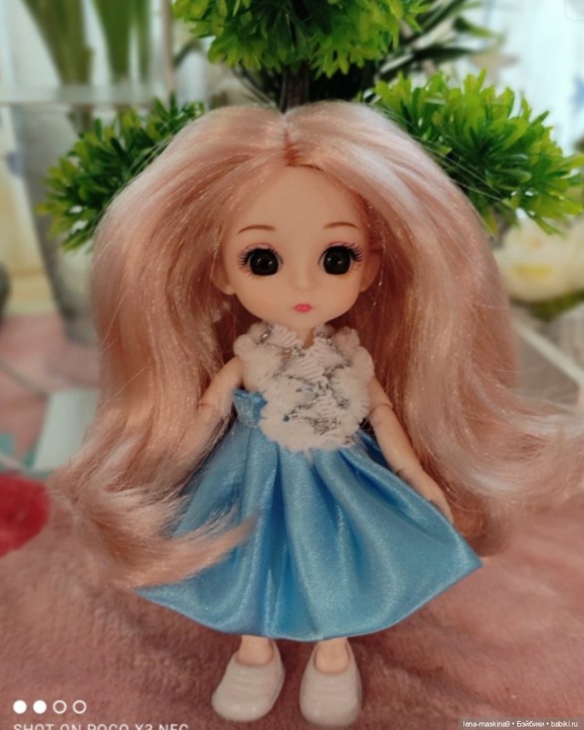 Хорошо сделаная коробка, пластиковая подложка, красивое, хоть и простое платье и трусики. Волосы необычного цвета -блонд с розовым отливом, прошивка с пропусками. Волосы жирные, надо попробовать помыть, хотя волосы лезут, как бы после мытья она у меня лысой не осталась…