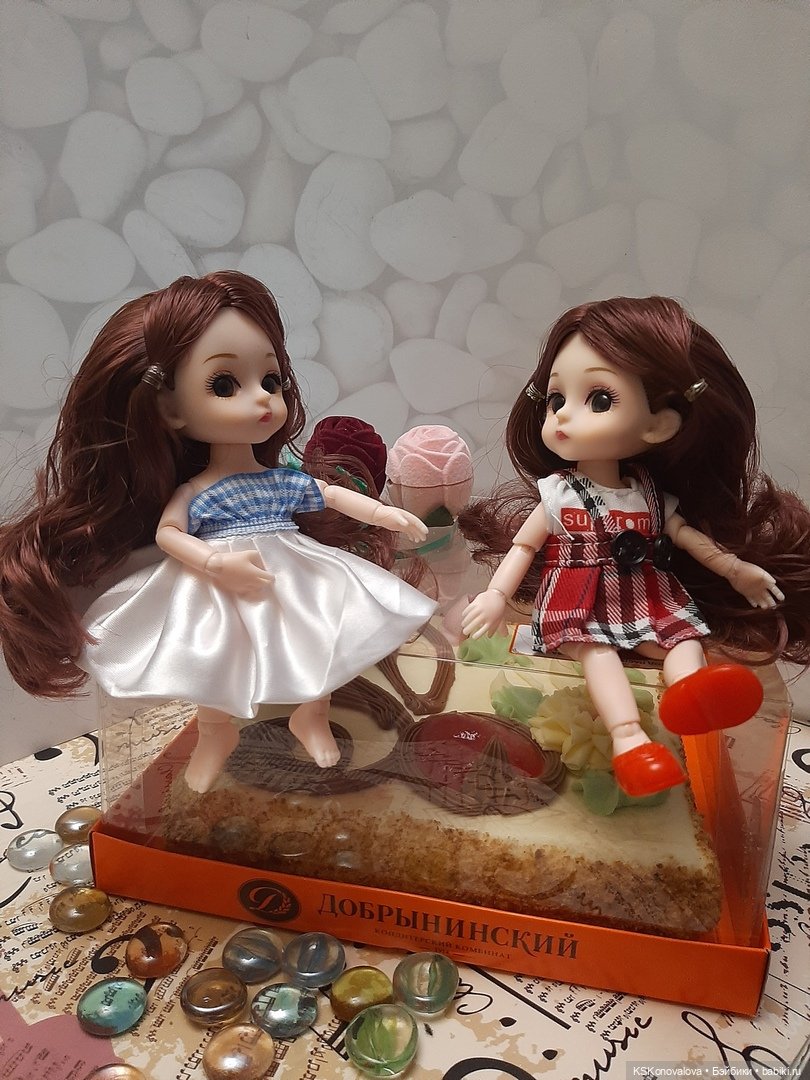 А про тортик — бывает в 5ке ещё маленькие за 89 рублей. Коробочка прям кукольная. Подходит для Барби и Паолок.