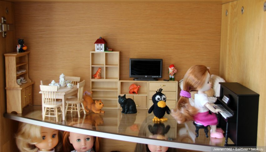 Вот быстрофото нашей мебели, пока нашлось место на полочке с посторонними глазами. Диванчик у нас тоже есть, я его для Машки вязала, как раз по размеру Варваре подходит, его не очень видно из-за пианино.