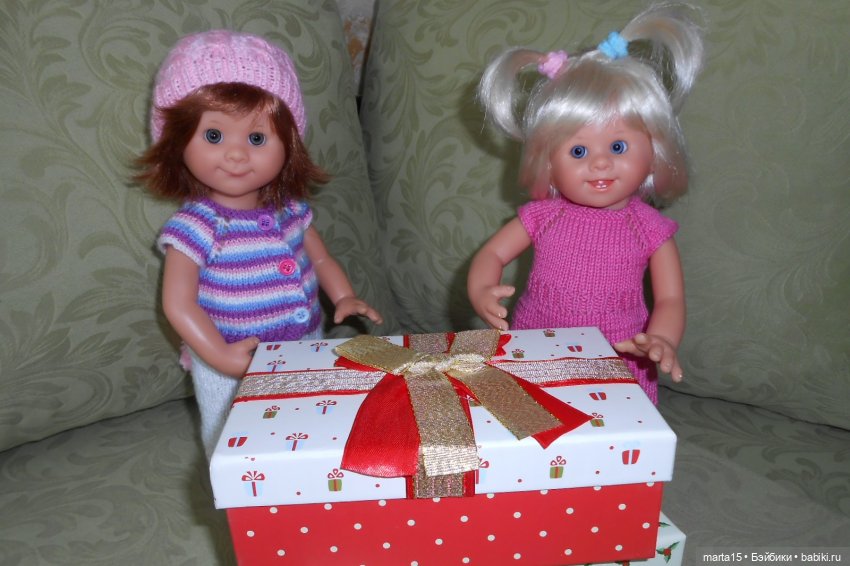 А вот тут мы вернёмся к волшебной коробочке с удивительными нарядами и другими сюрпризами. Наряды, которые для Баболек создала Света, это настоящие произведения искусства — одни виртуозно вывязанные рюши и воланчики чего стоят. Я ещё по фото изумлялась работой Светы, а получив наряды в руки, долго рассматривала и любовалась сама этим крохотным великолепием. Моим девчонкам даже пришлось напоминать о себе, что платья для них связаны — отдай, мол, уже немедленно!