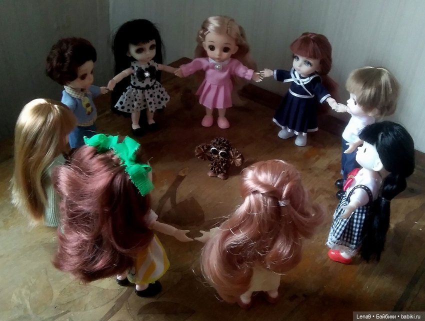 Куколки просто удивительные — вроде совсем не дорогие, но такие ладные, подвижные и размер очень удобный. Даже моя старшая, на тот момент девятилетняя дочь, к куклам до сей поры равнодушная, прониклась этими малышами. С удовольсивием стала играть в них совместно со средней, просить у меня для них наряды, и даже таскала свою Мальвинку в школу. Из большой коробки мы соорудили для баболишек дом, который пока в процессе наполнения и украшения. Из коробок и картона туда мастерится мебель, а из тряпочек — постели. Из мягкого пластилина лепится какая-то посуда и еда. И на прогулки и в гости частенько куколки ездят с нами. Например, гуляли в ботаническом саду: