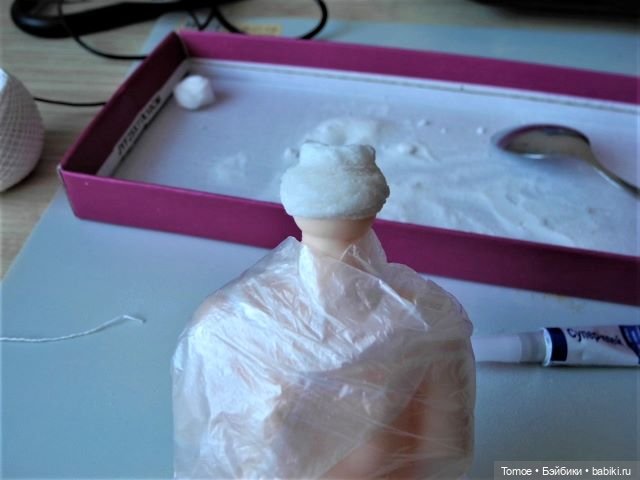 Точку суперклеем на шарик, приложить нитку — закрепили начало. Несколько витков обомотки, промочить суперклеем и осыпать содой с ложечки. Выждать минуту — там такая реакция, что оно горяченное! Продолжаем: обмотать — смочить клеем — посыпать содой. До достижения оптимального результата (примеряем голову).