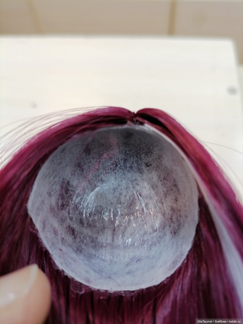 Пробор вклеивала в разрез на отдельную пластиночку, потом долго её разглаживала утюгом) После чего пластиночку приклеила на парик)