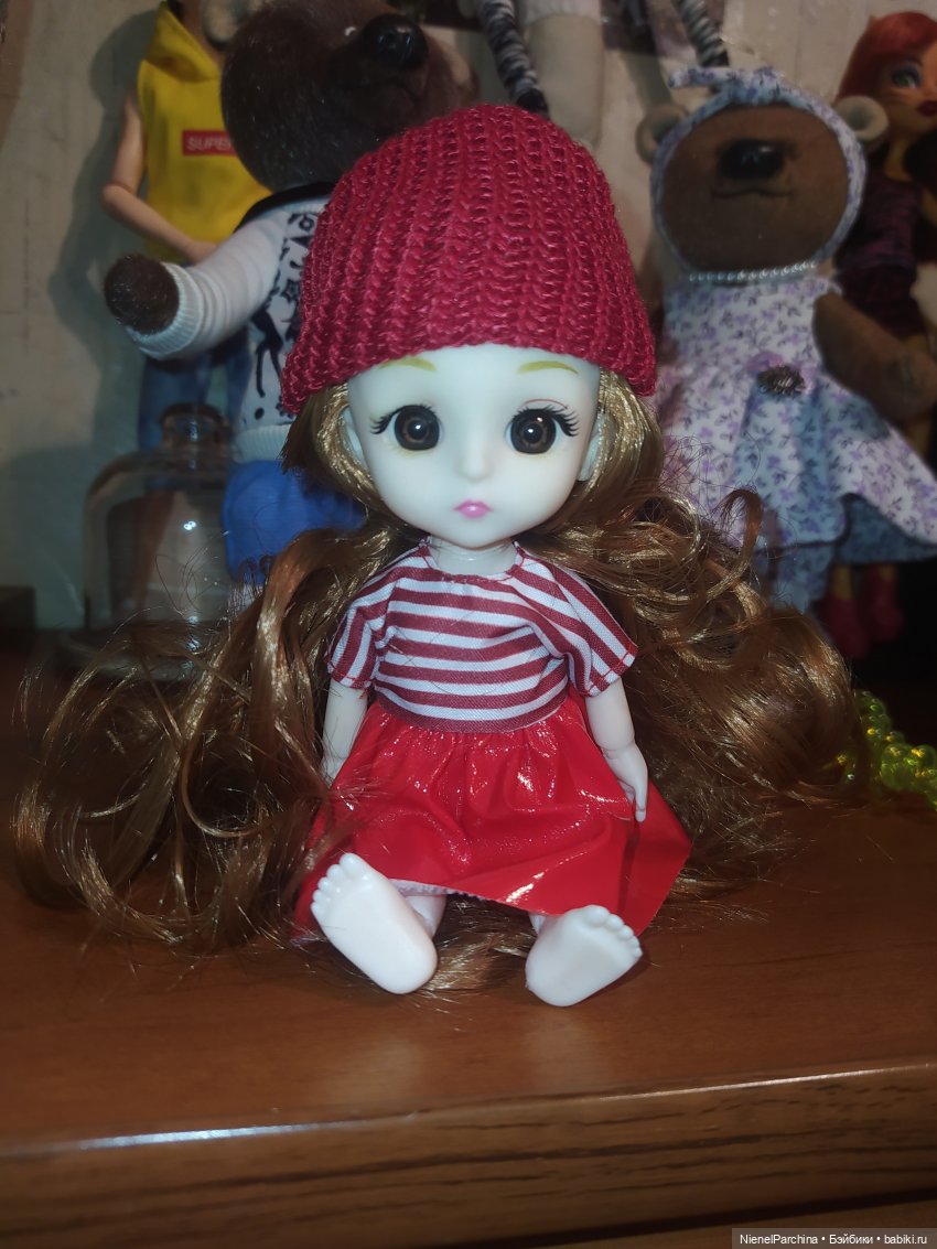 Кукла представлена в одном варианте. В комплекте с ней очки. Шарниры хорошие, кукла стоит сама без опоры. Волосы прошиты в несколько рядов. Но, если опять же сравнить с аналогичной куклой из Фикс Прайса, то их меньше — возможно это из-за наличия чёлки. Цвет волос на тон ниже, чем кажется на картинке на сайте. Я хотела себе рыжую-рыжую… Ладно, будет жить в моей «Так себе коллекции»:).