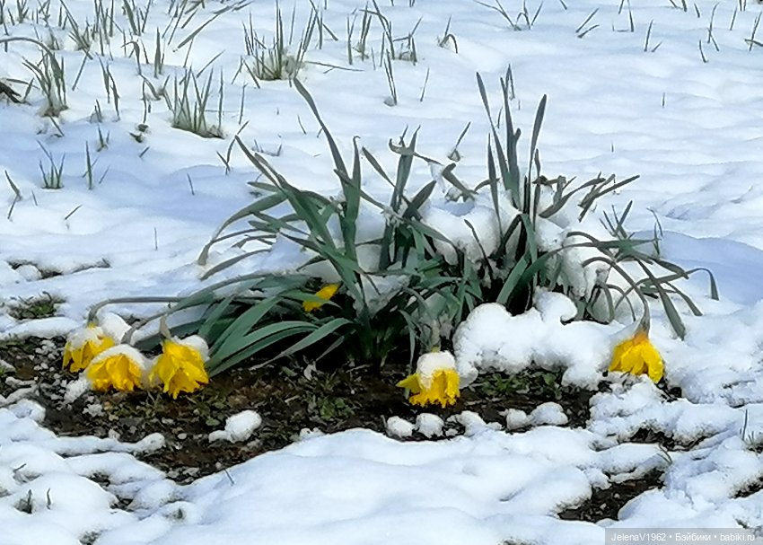 После неожиданного наступления зимы со снегом и морозом до -10 ночью нарциссы лежали на земле,