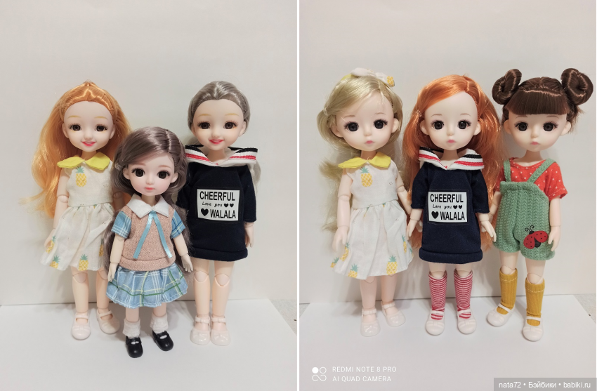 А здесь слева — в центре ещё одна девочка 19 см (она сразу на этом теле была) и две девочки ещё «постарше», 23 см (правда, одеждой своей эти двое пока не обзавелись, попросили временно у других); справа — три сестрёнки ростом 23 см:
