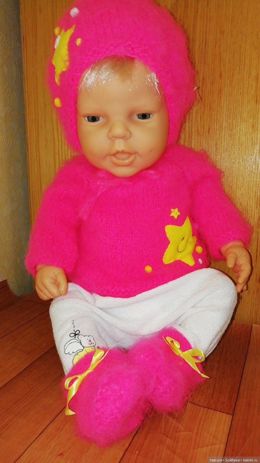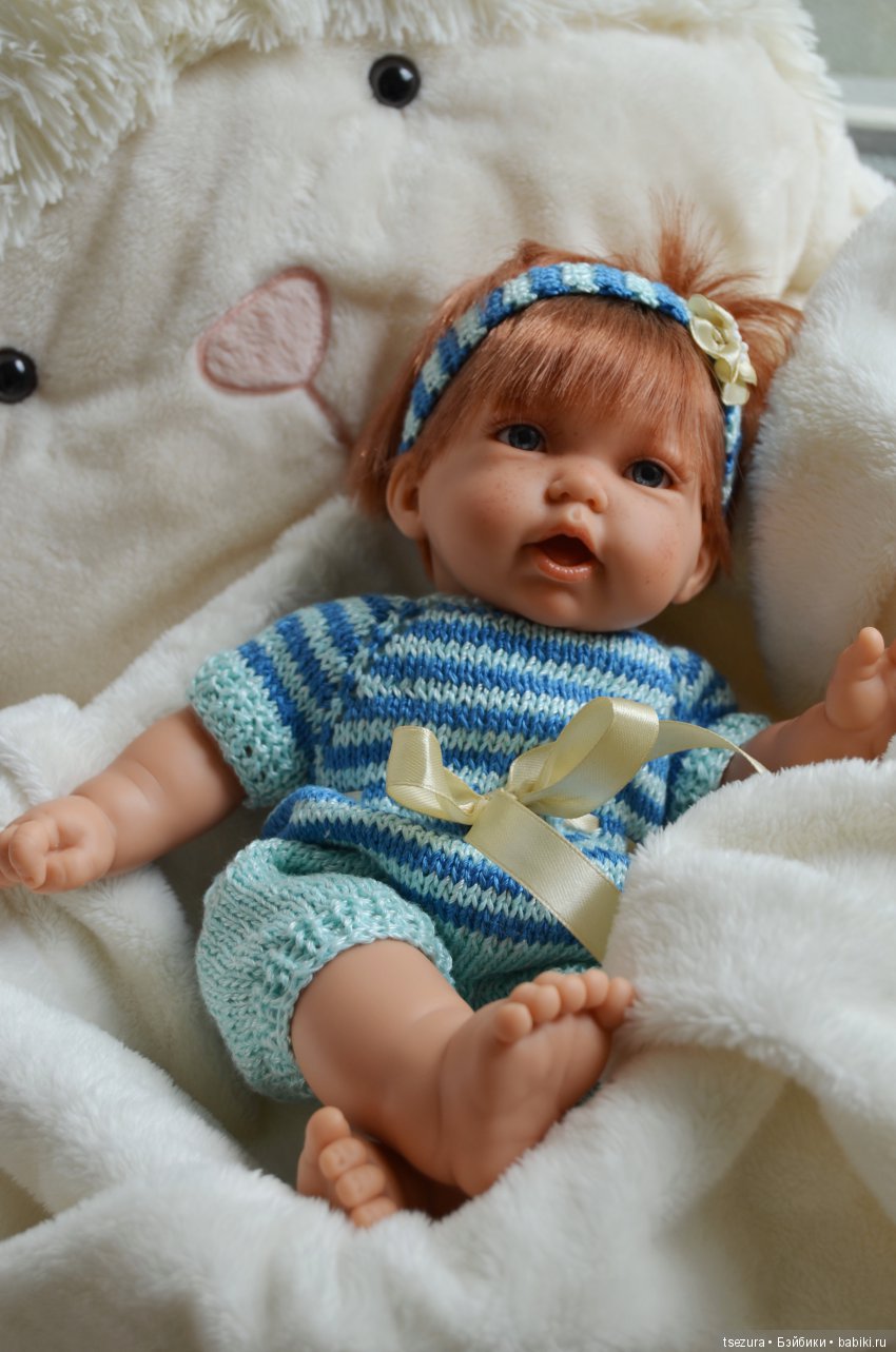 Я что-то прямо подсела на крупненьких пупсов! Только что тоже обвязывала ещё одну малышку, бончику тоже такое вязала, но подарила… Хотя этот комплект, наверное, тоже подойдёт, не намного малышечка покрупнее.