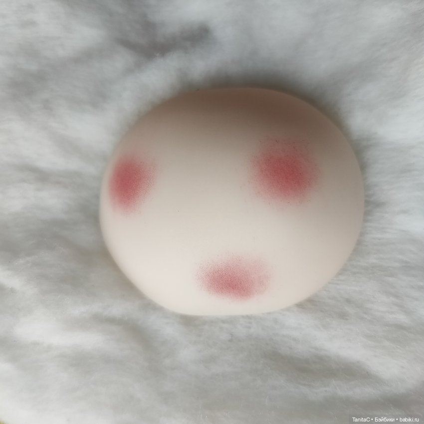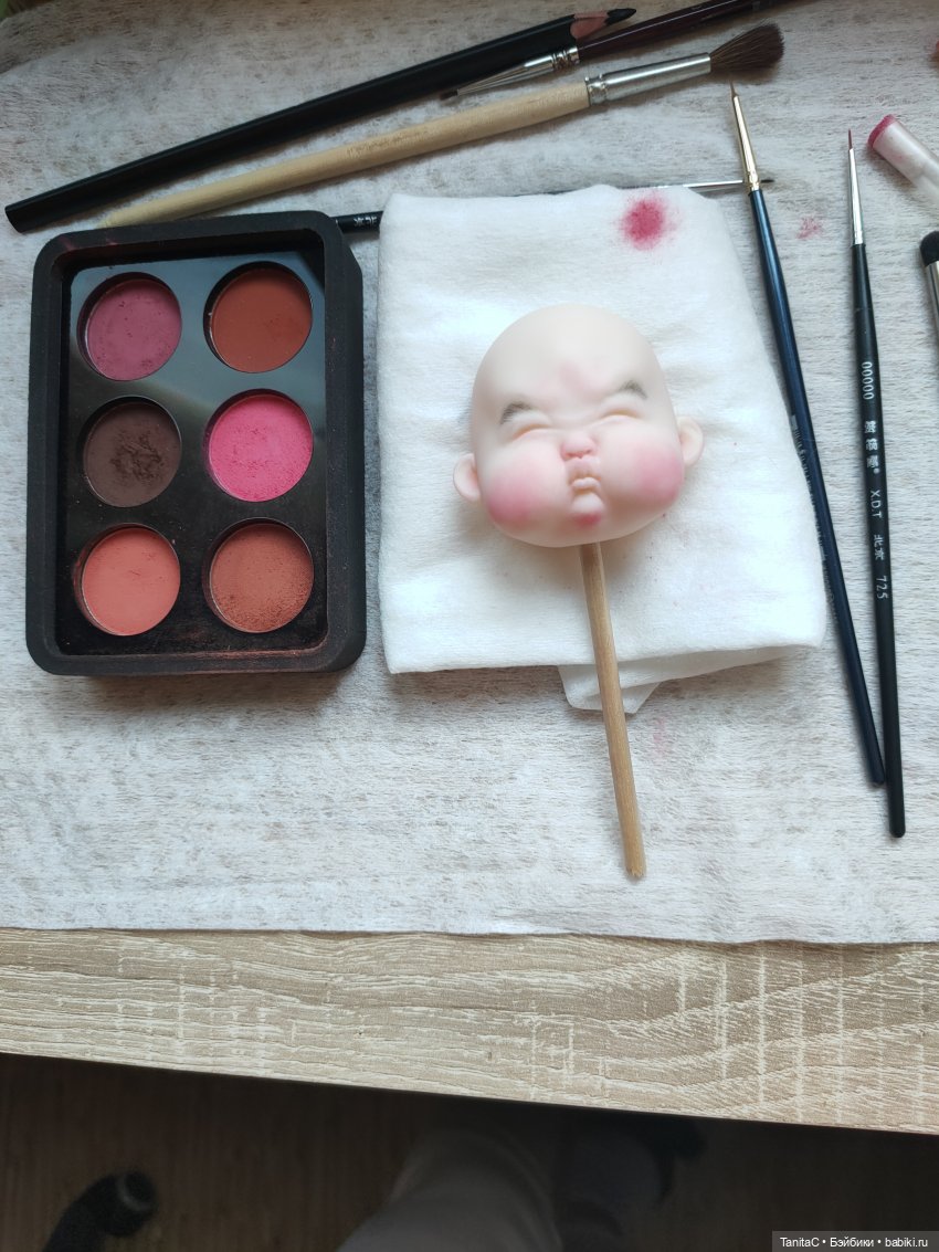 2) набрать пигмент кистью прямо с мелка. После этого необходимо удалить с кисти лишний пигмент, «потоптавшись» ею по бумажной салфетке, например, иначе получите неаккуратные разводы на кукольном лице вместо тонких переходов.