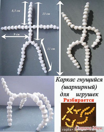 Крепить каркас не надо, просто вставить в ручки ножки и голову, главное каркас чтобы был по нужному размеру