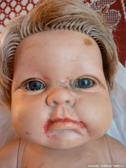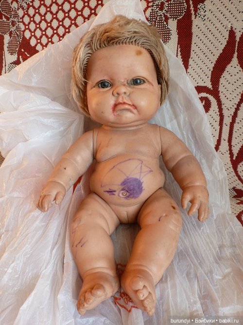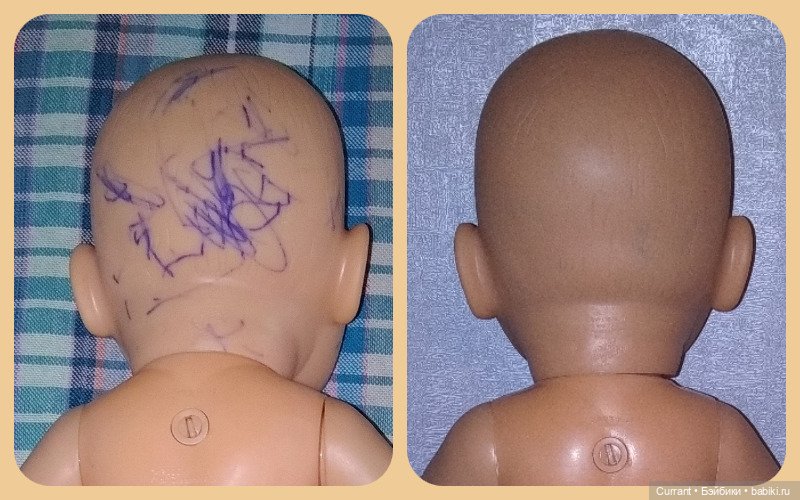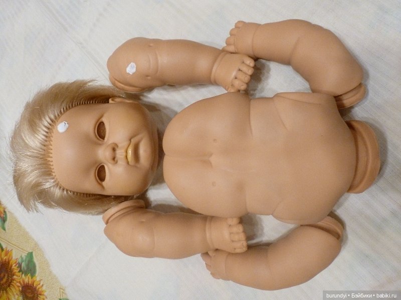 С грязью справились без особых проблем. Чернила вывели за двое суток. Поскольку пупс попал ко мне в конце лета, удалось справиться за столь короткое время — два жарких дня и тёплые ночи. Способ лечения прост: густо обмазала базироном (можно использовать угресепт), плотно обернула пищевой плёнкой и положила на подоконник. Благо окна выходят на юг. А вот пятна от йода лечу до сих пор, практически 8 месяцев идёт у нас лечение. Пятна сильно побледнели, но ещё видны. Надеюсь, что удастся от них избавиться, до полного очищения винила. За одно и остальные части тела держу на свету и в тепле. За прошедшее время винил конечностей и туловища окончательно очистился (высветлились все серые пятна-разводы) и выровнялся цвет. От базирона иной раз остаются белёсые пятна, которые с течением времени проходят.
