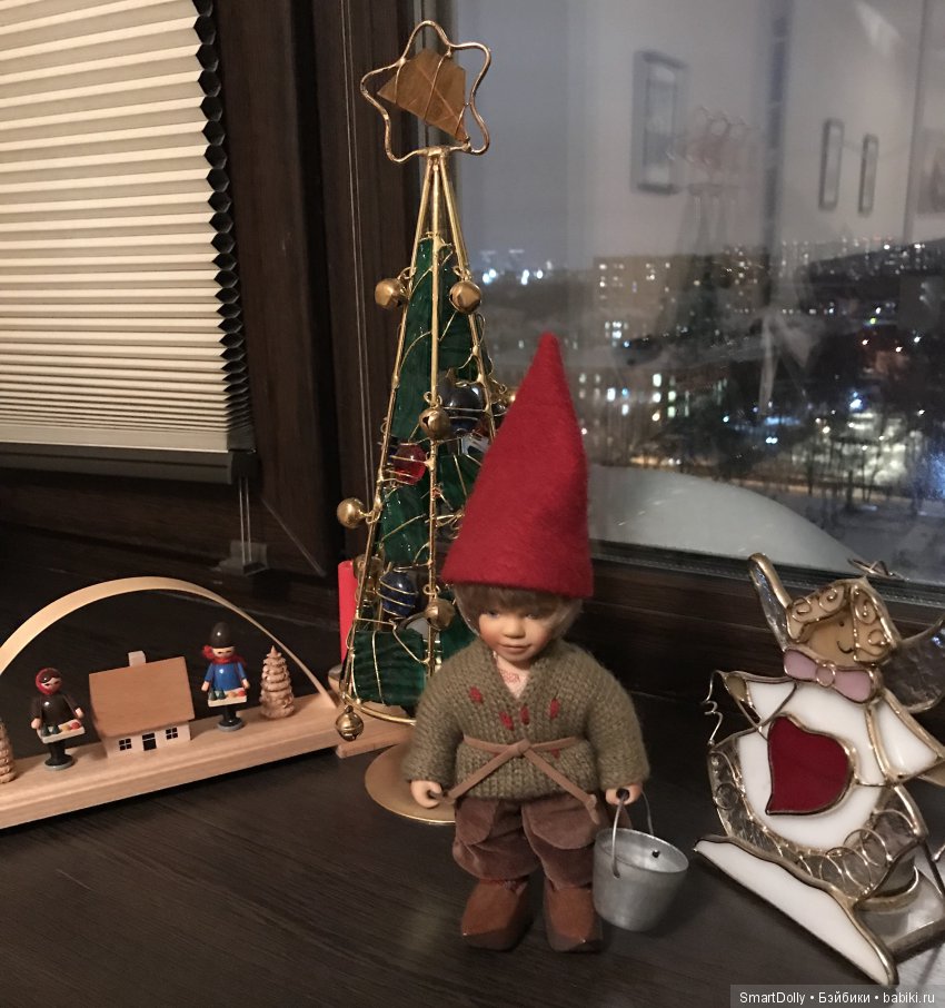 У меня таких гномиков нет. Но за пару месяцев до Нового Года мне досталась вот такая маленькая девочка. Я ее не стала убирать в коробку с елочными игрушками, она так и сидела, и дождалась махонькую елочку.))