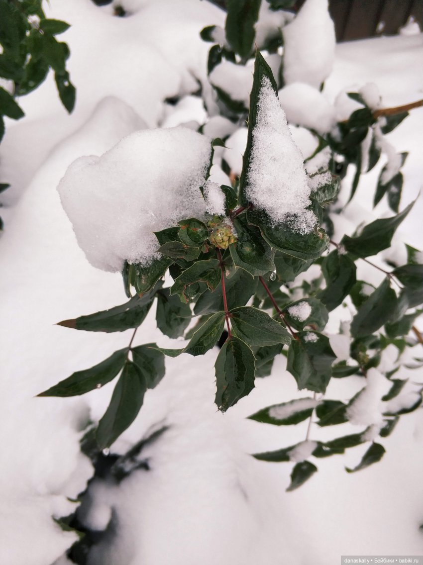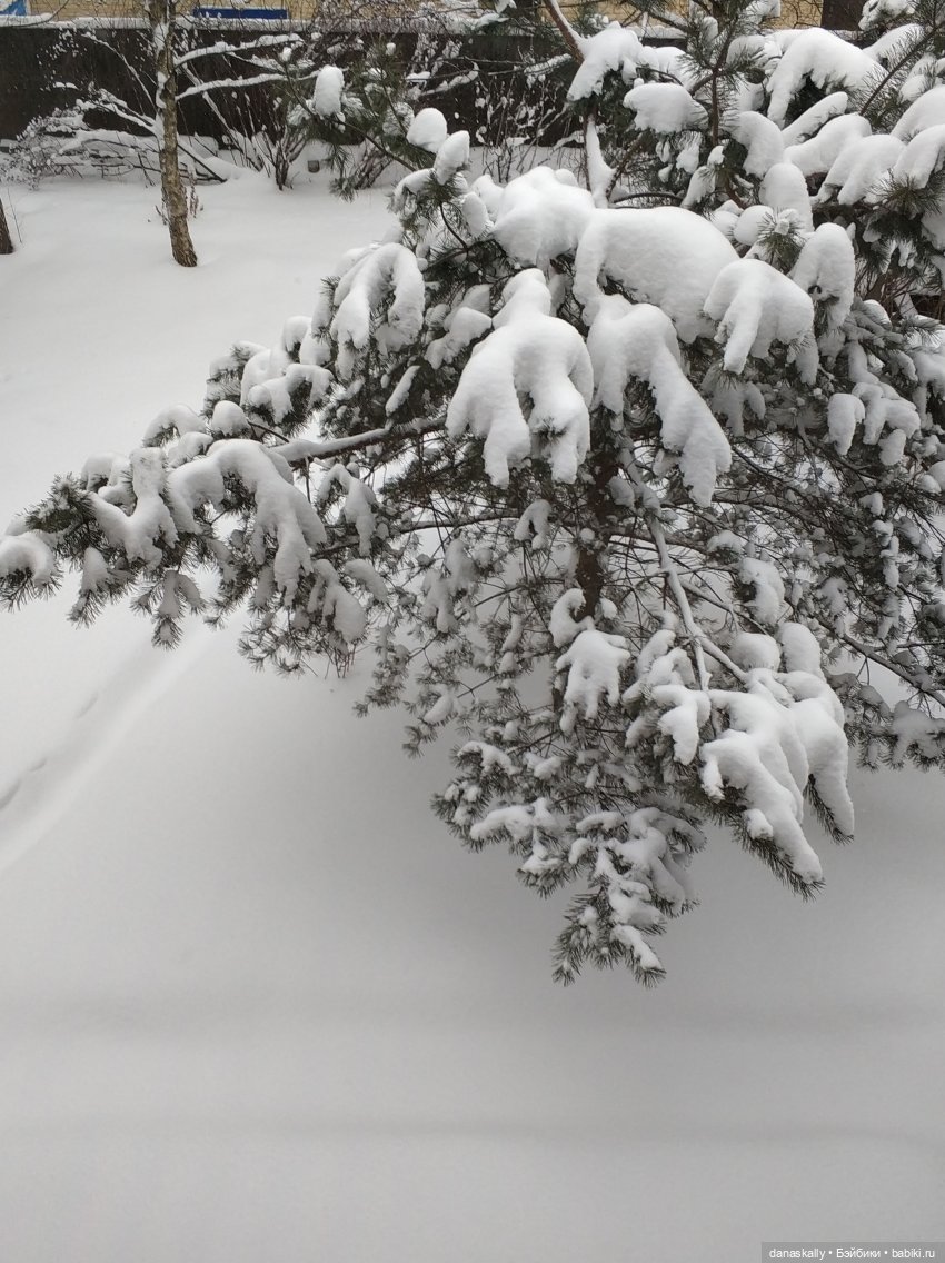 Это наш загадочный вечно зеленый куст. Снежинки большие- большие…