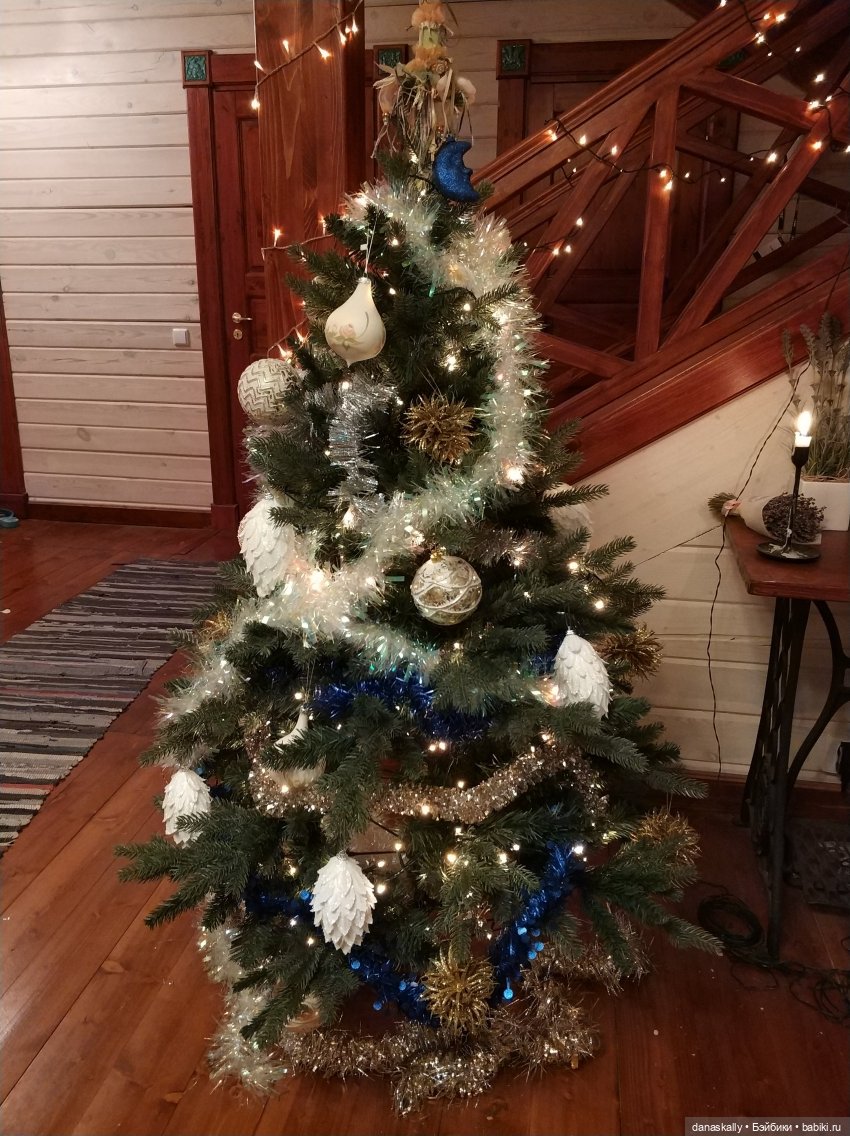 После ледяного дождя сосну перед домом Сашка и мой муж отказались наряжать. Так в доме появилась смешная ёлка с большими игрушками.