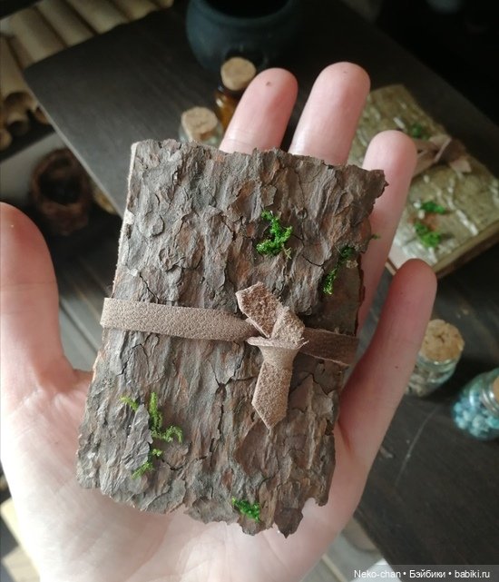Обложки сделаны из настоящей коры сосны и осины, натуральной кожи и сухого мха.