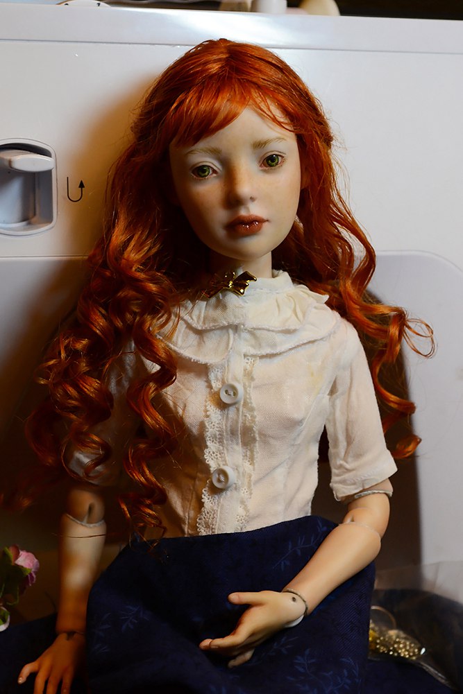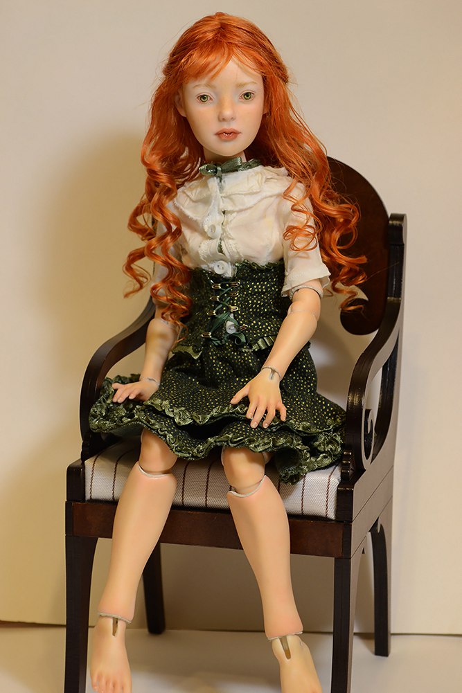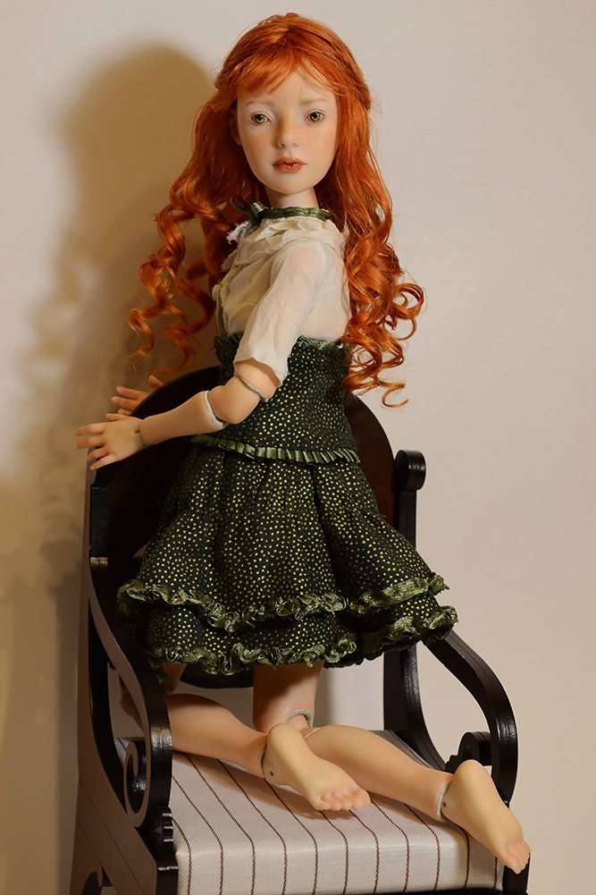 Эта кукла для меня была экспериментом. В ней я попыталась добиться эффекта живой кожи. К сожалению, фотограф из меня никакой, поэтому на фото не видно, но у нее есть вены, родинки, веснушки по всему телу. Сделана из фарфора, роспись надглазурка, одежда для куклы кожа + хлопок.