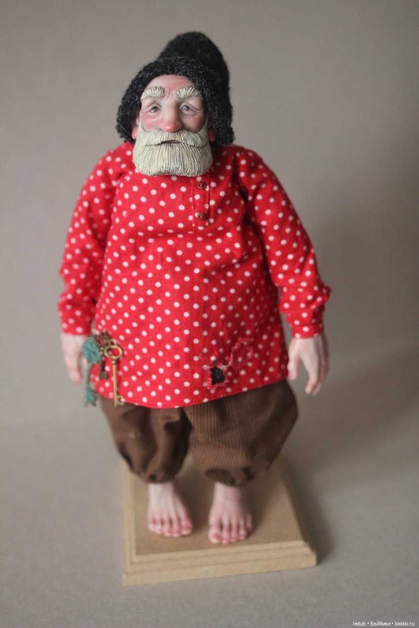 Некоторое время назад у меня заказали деда без одежды. Клиенты (муж с женой) пожелали самостоятельно его обшить.(Полосатый комбез от другого деда)
