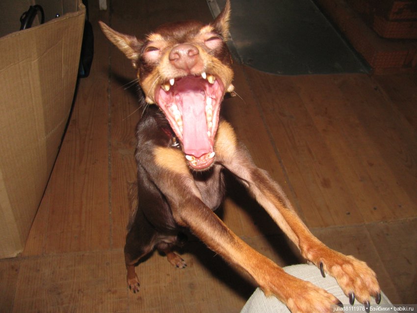 А это мой «страшный» той-терьер Архип. Зевает — без куклы ему скучно)