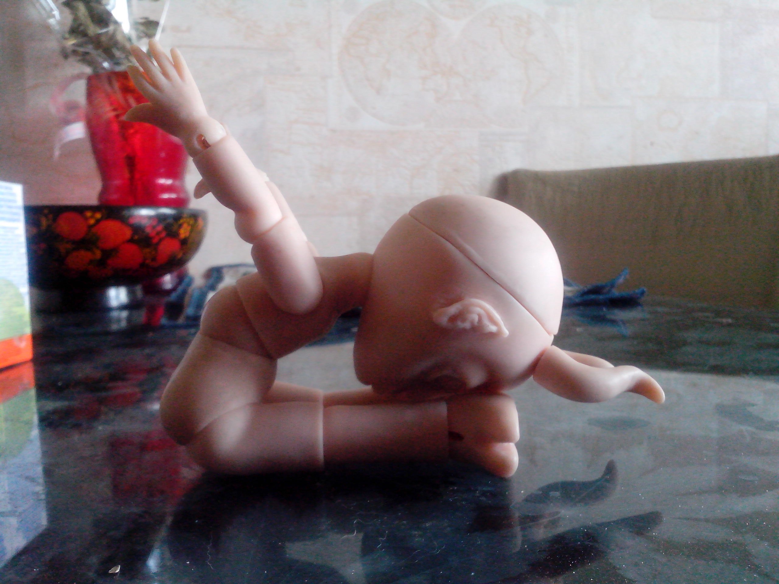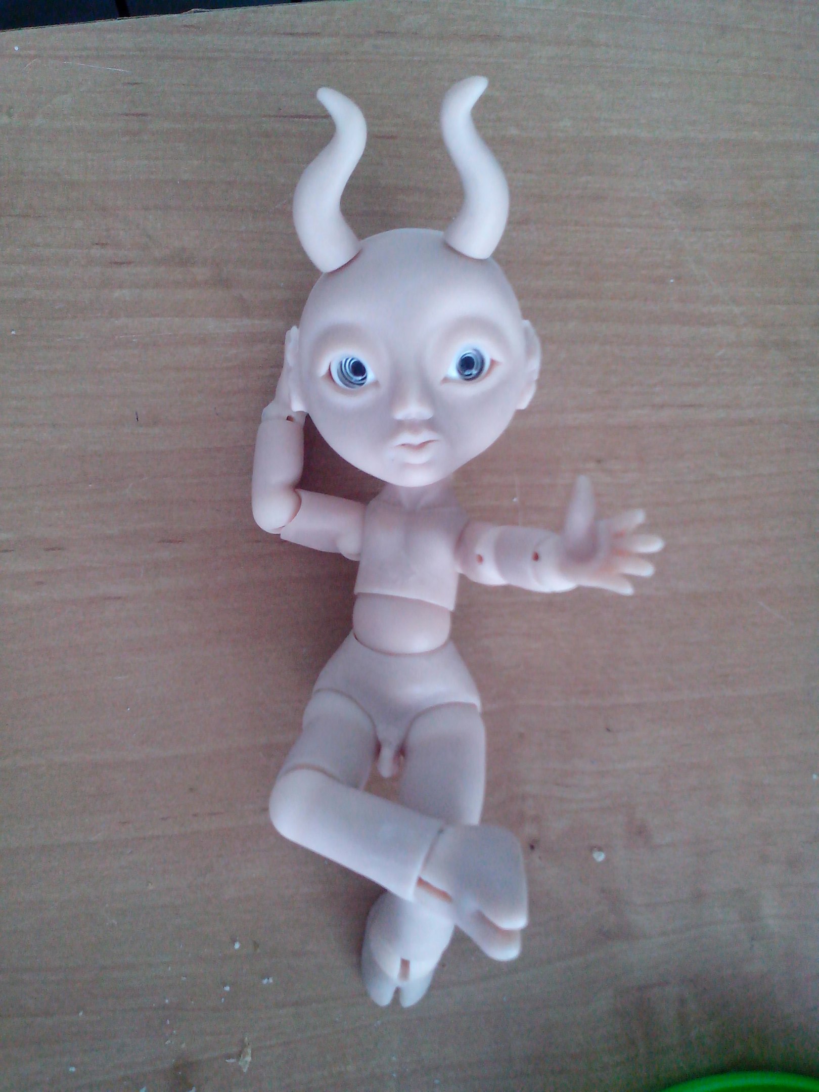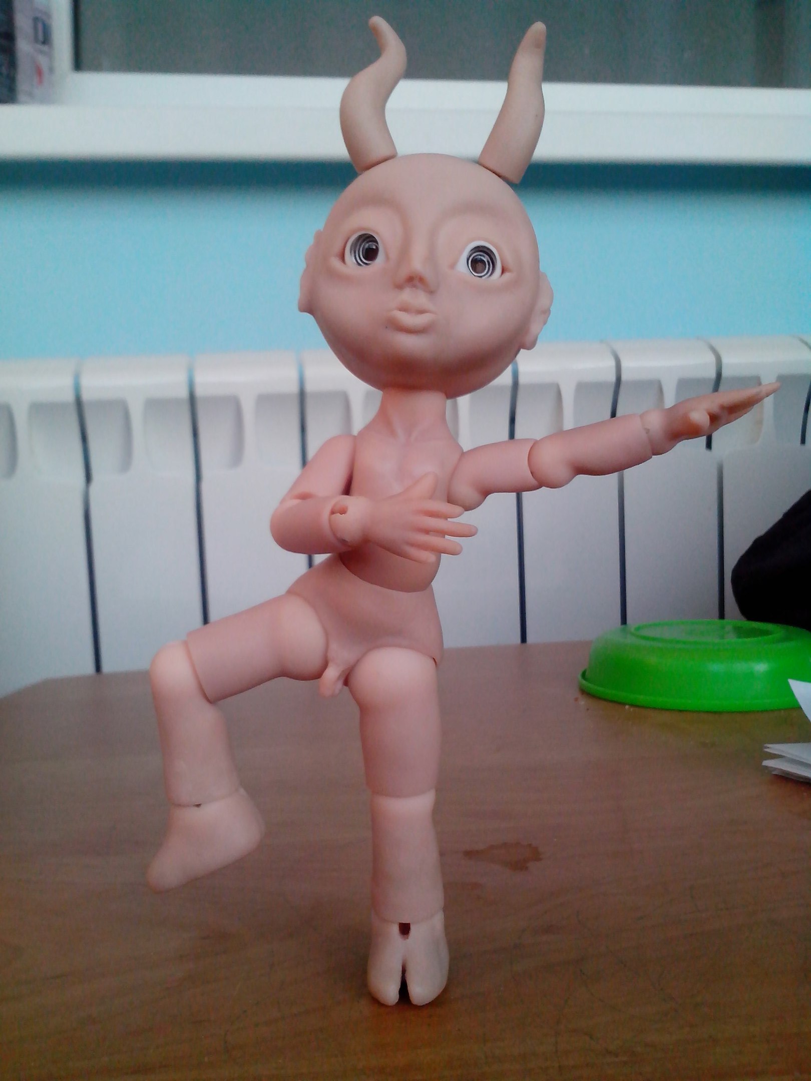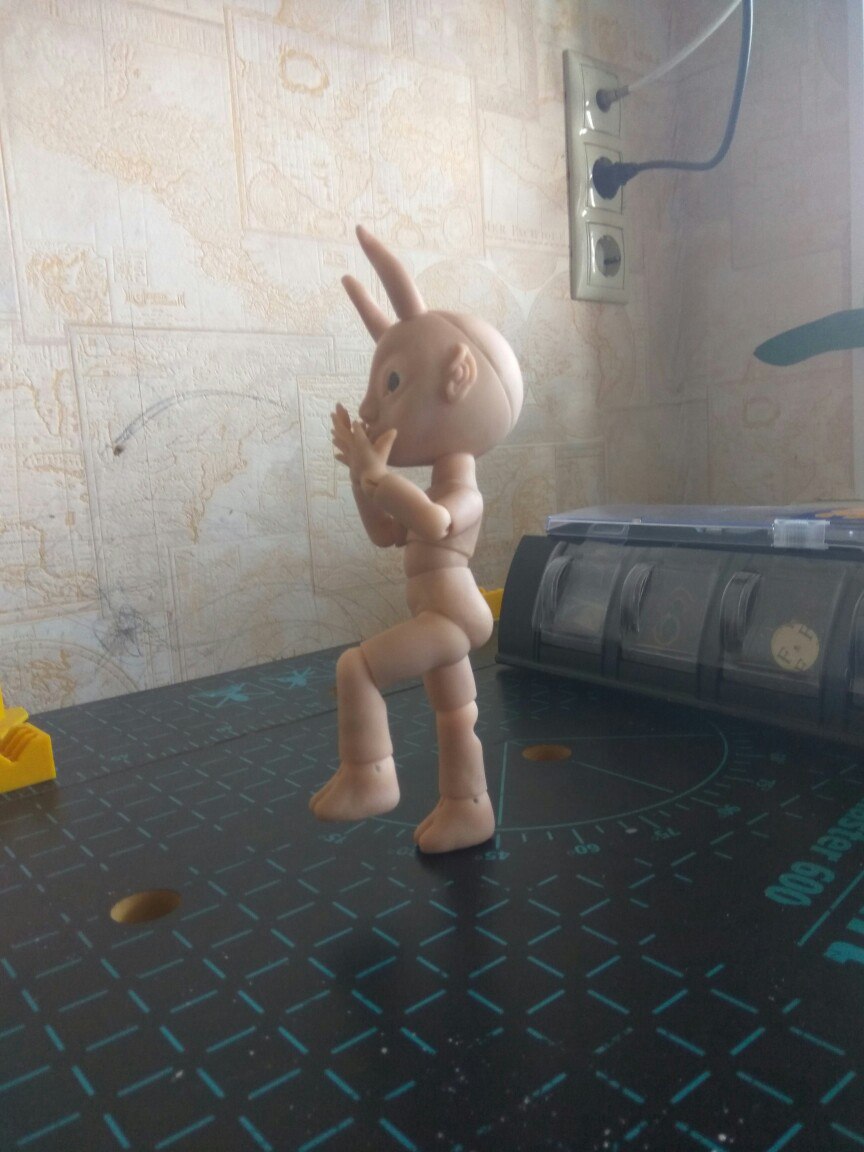 «Я что балериной заделался?» (Коротковаты предплечья, рез под резинку в шарнире левой ладони ушел на бок — этот дефект видела сразу при пропиливании, но так хотелось поскорее малыша собрать, что оставила как есть — по хорошему нужно слепить новую ладошку или хотя бы новый шарик для этой — пока что лень)